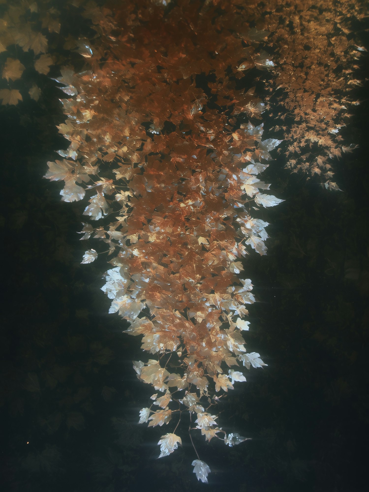 A cascade of golden autumn leaves illuminated against a dark background, creating a serene and ethereal visual effect.