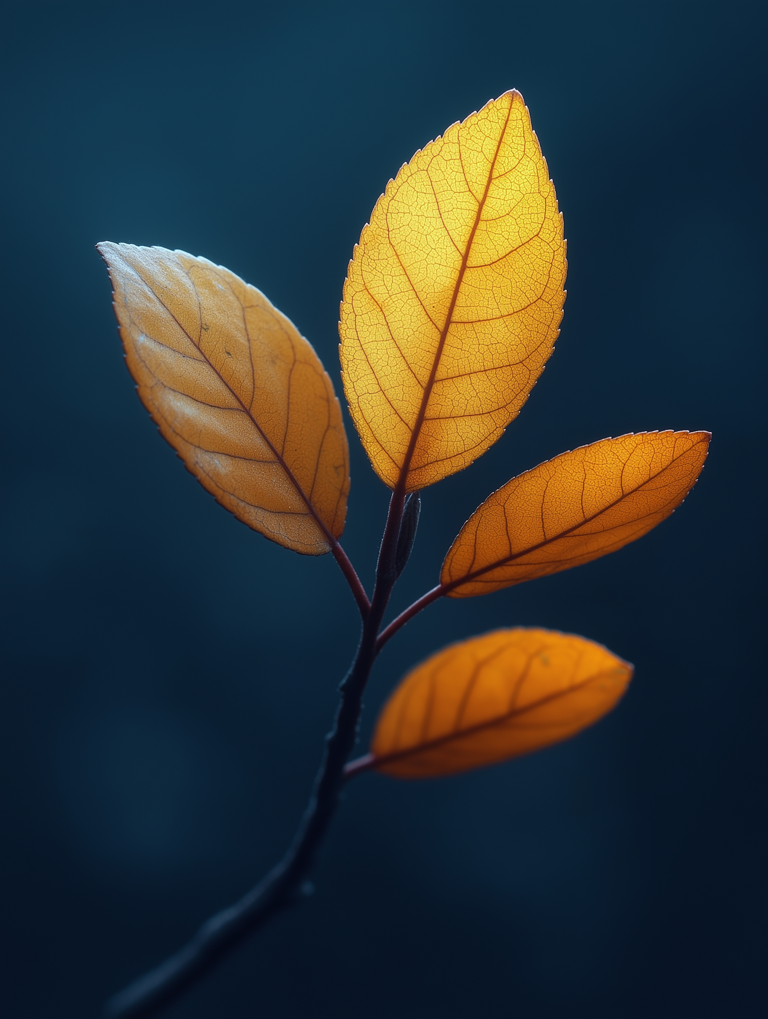 Vibrant orange leaves on a branch against a dark blue background, showcasing intricate vein patterns and glowing in soft light.