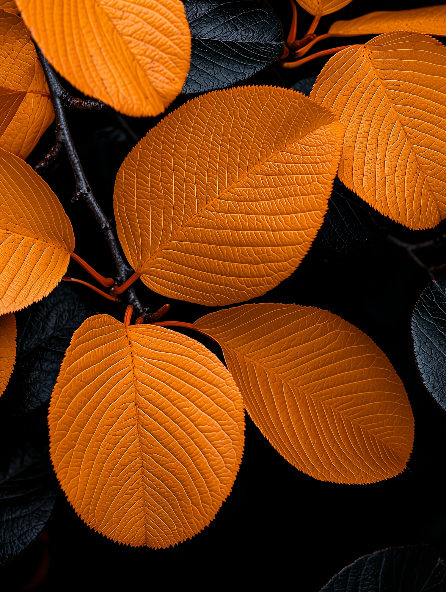 Vivid orange leaves with detailed veins contrast against dark foliage, creating a striking and dynamic natural composition.