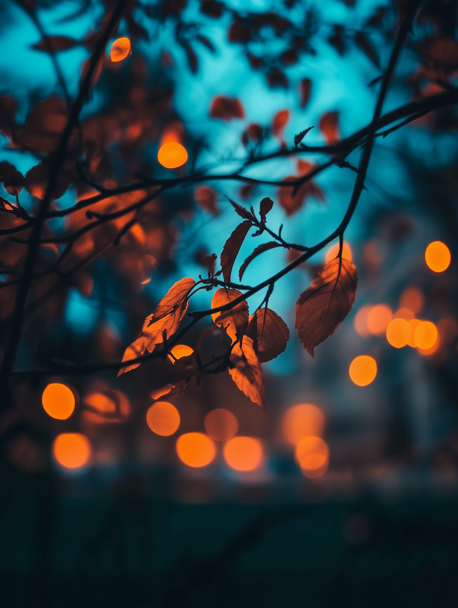 Autumn leaves on branches with warm orange bokeh lights and a teal-blue sky, creating a serene and atmospheric twilight scene.