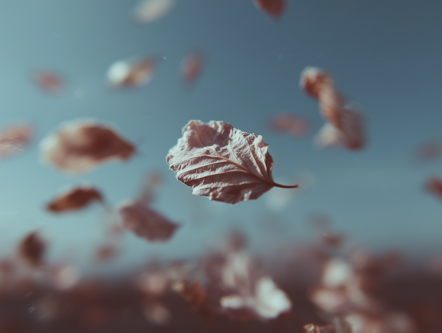 Autumn leaves gracefully floating against a clear blue sky, showcasing their intricate textures and warm hues in a serene composition.