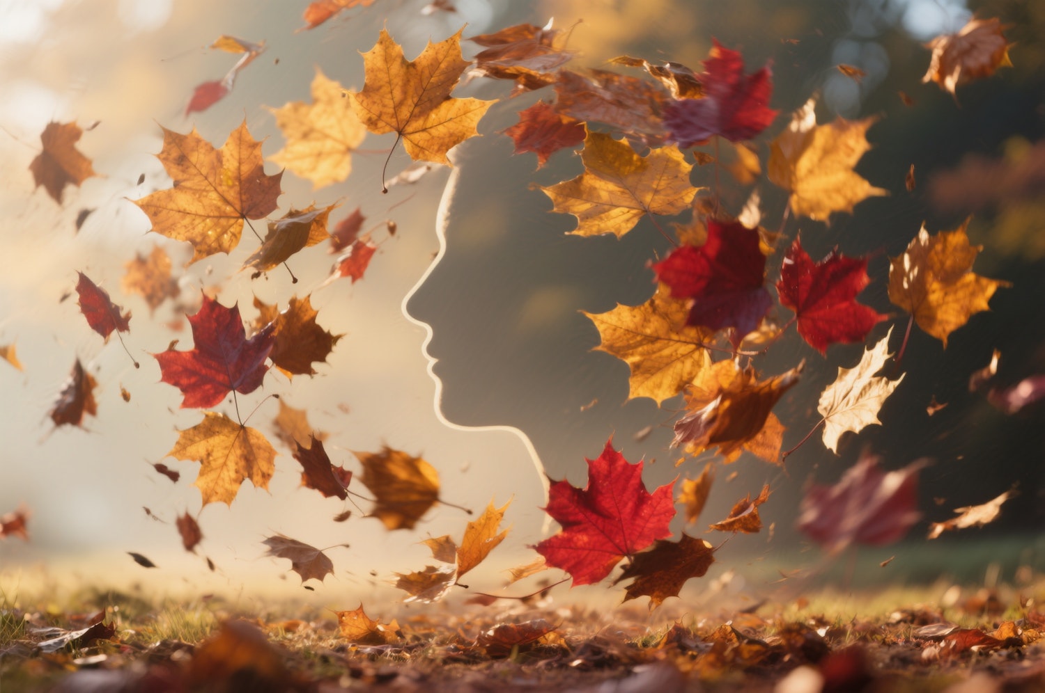 Autumn leaves form a glowing human profile silhouette in a warm, golden light, creating a serene and artistic seasonal scene.