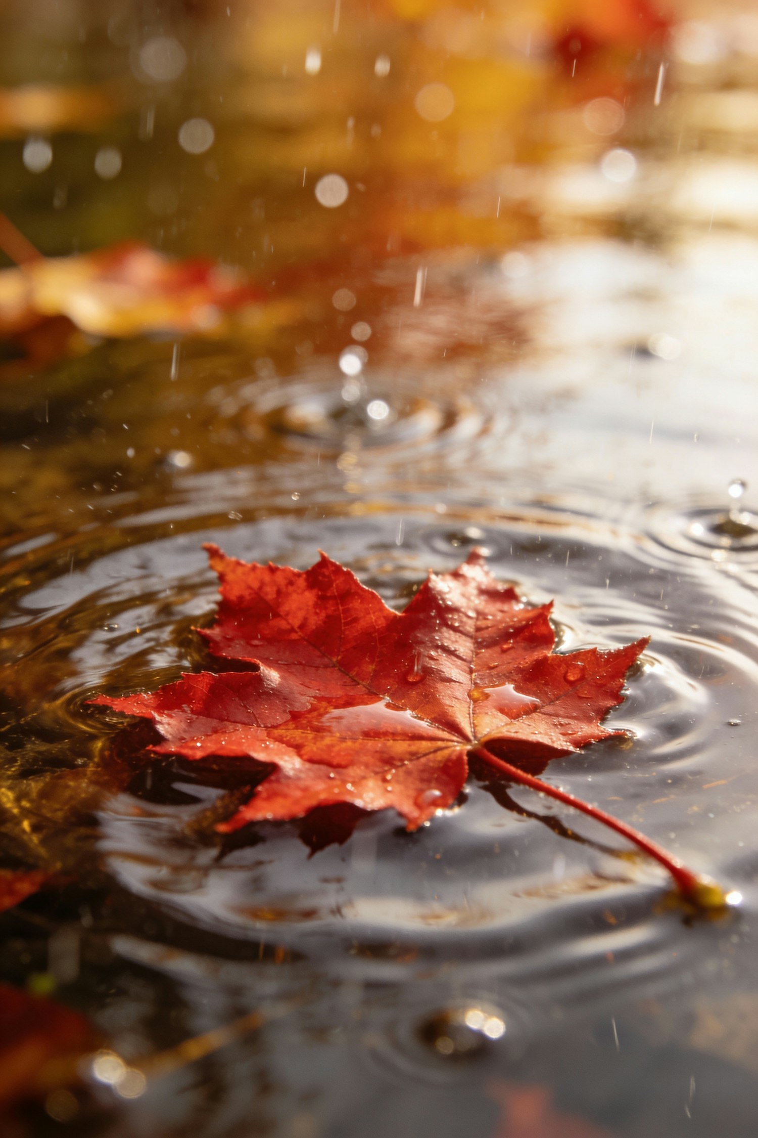 A vivid red maple leaf floats on a puddle, surrounded by ripples from raindrops, capturing the serene beauty of autumn.