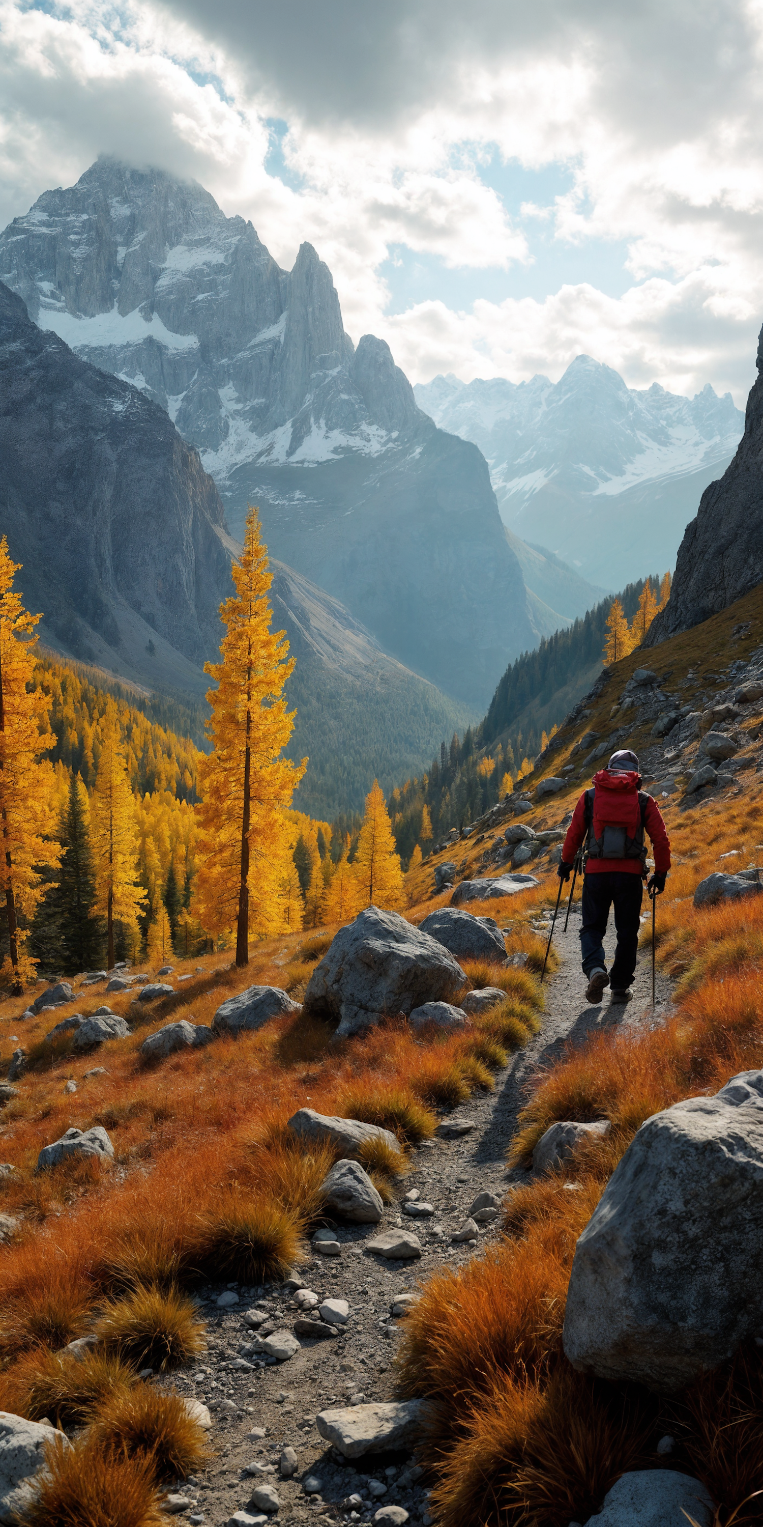 A hiker explores a scenic mountain trail surrounded by golden autumn trees and majestic snow-capped peaks under a cloudy sky.