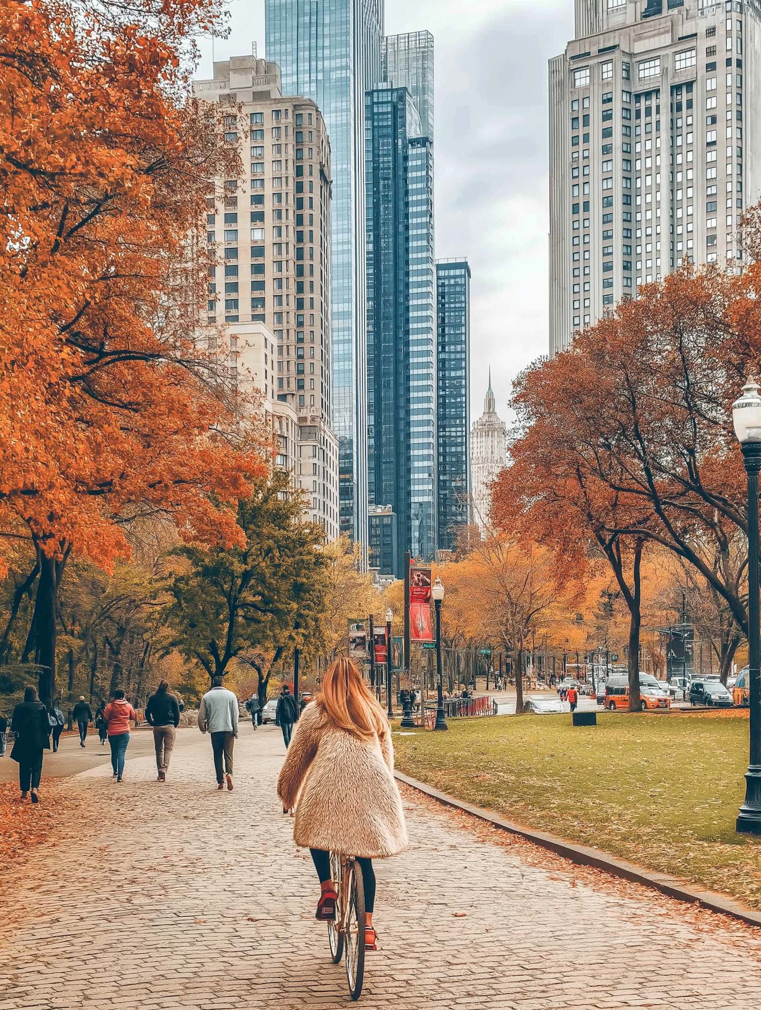 Woman cycling through a park with autumn leaves and skyscrapers in the background, blending nature and urban life.