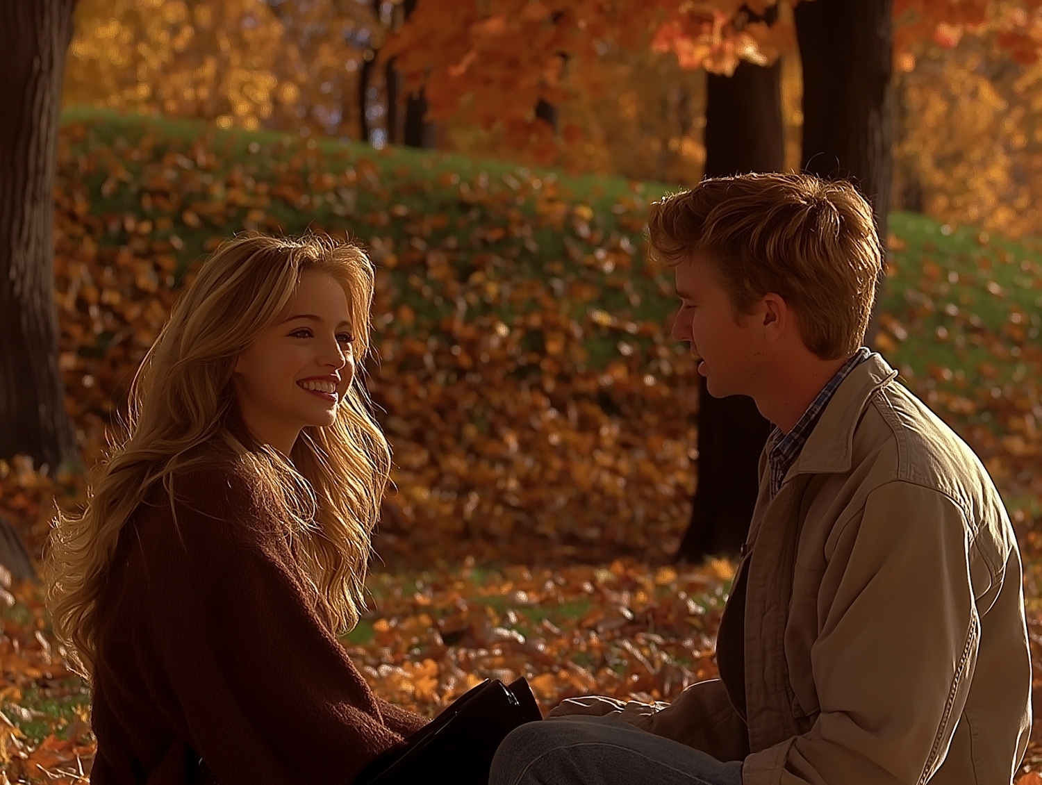 Young couple enjoying a romantic moment in a park during autumn, surrounded by colorful leaves and warm sunlight.