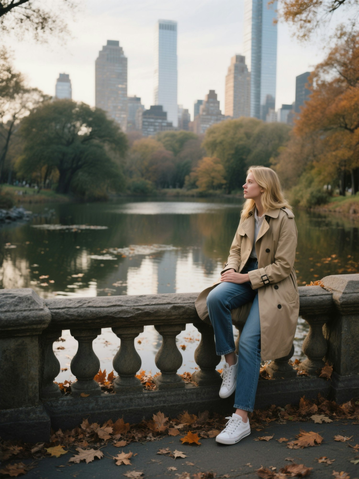 Disposable film camera photo, slightly dark vintage tones, soft grain, muted colors, authentic travel snapshot style, natural light, candid composition, depth of field blur, New York City atmosphere — a blonde woman wearing a beige trench coat, blue jeans and white sneakers, sitting on the stone railing in Central Park, looking at the pond with city skyscrapers in the background, autumn leaves around.