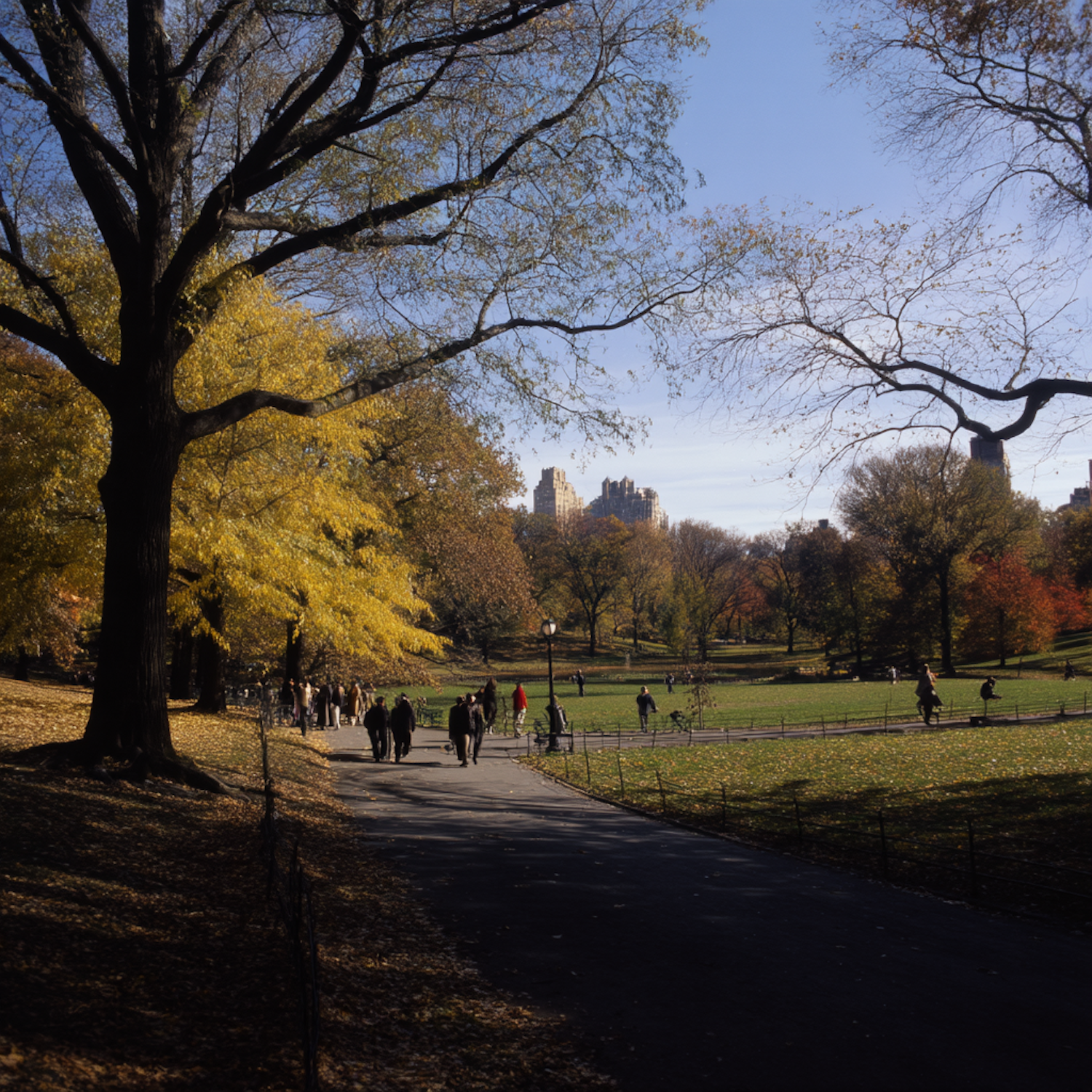 A peaceful autumn day in a park with golden trees, a winding path, and people enjoying the outdoors under a clear blue sky.