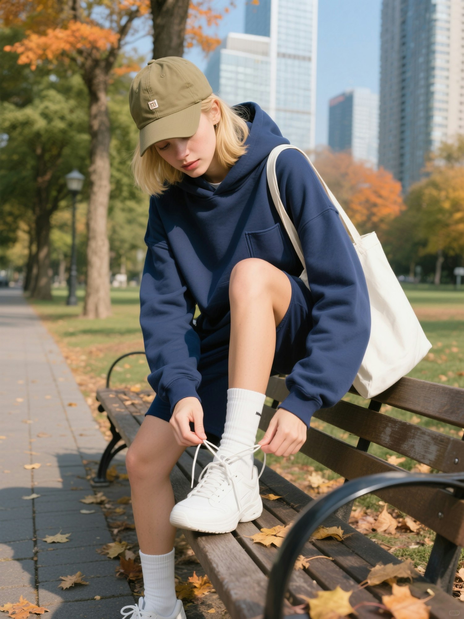A young woman in a navy hoodie ties her sneakers on a park bench, surrounded by autumn leaves and a cityscape in the background.