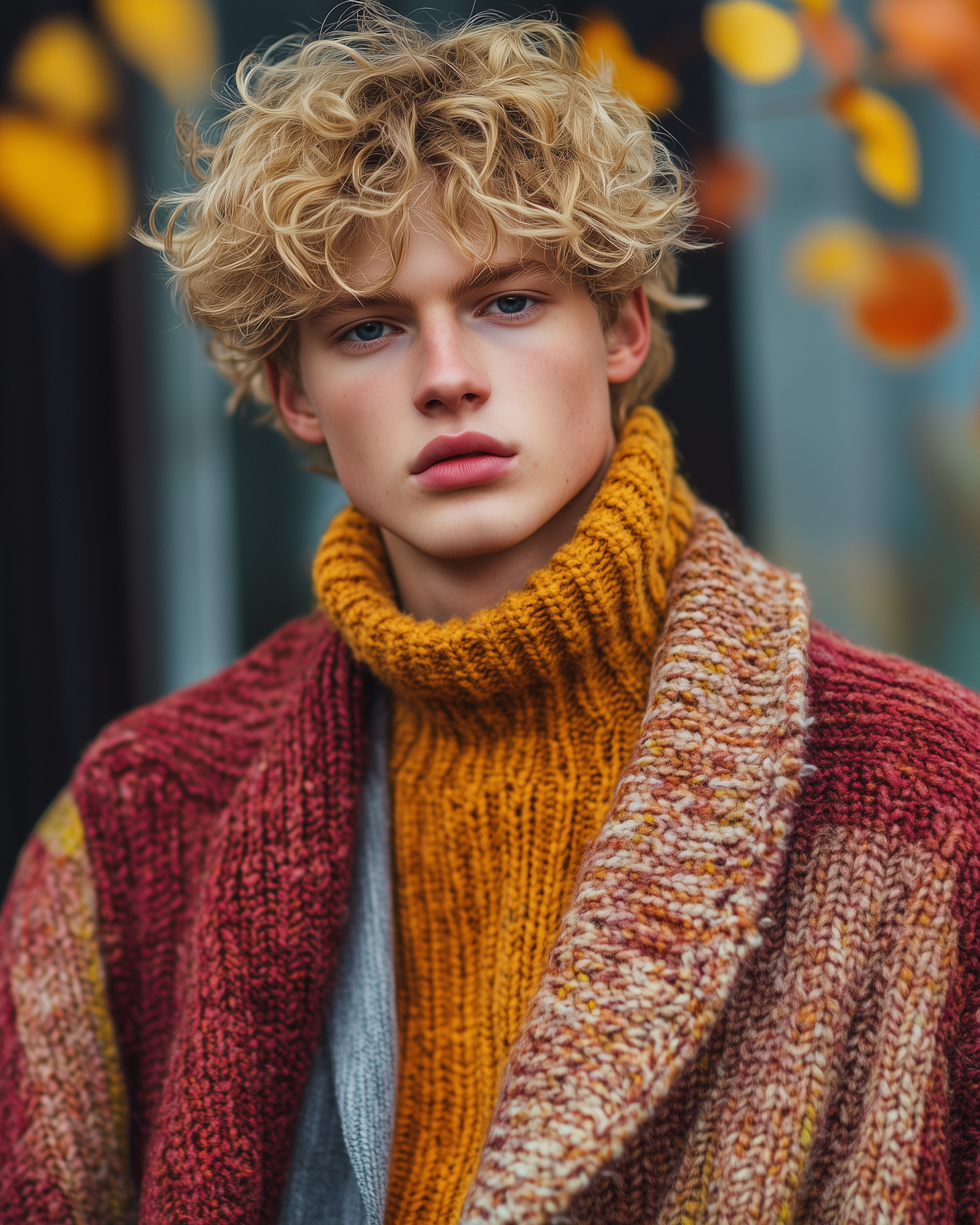 Young man with curly blonde hair in a mustard turtleneck and knit coat, set against a blurred autumn background with warm leaves.