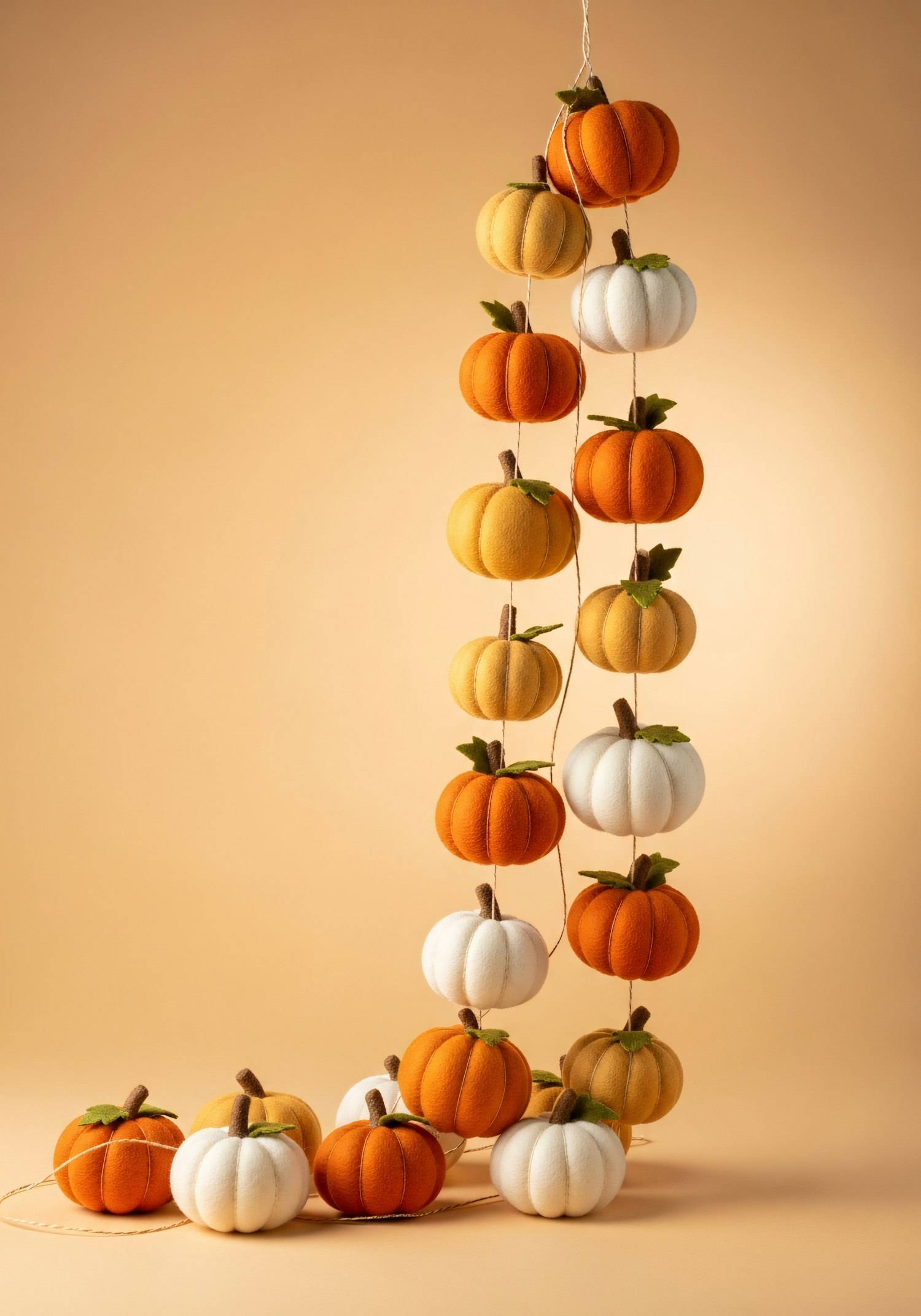 A charming display of fabric pumpkins in autumn colors, strung vertically with some scattered below, perfect for seasonal decor inspiration.