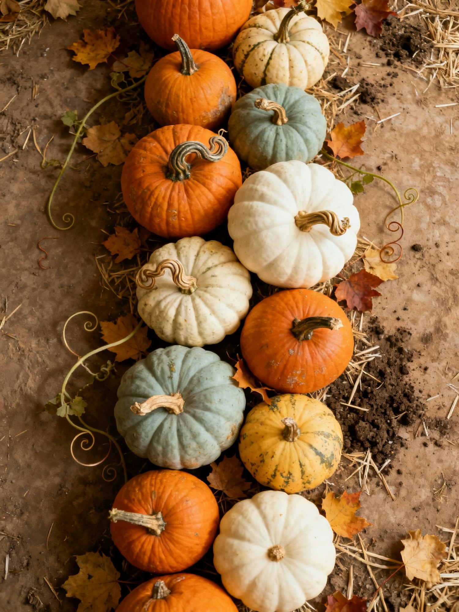 A cinematic overhead still life of assorted pumpkins arranged in organic, column-like harmony — a visual ode to autumn’s geometry and warmth. Varieties of pumpkins and gourds in shades of deep orange, muted sage, creamy ivory, and soft ochre flow naturally across a textured, earthen surface dusted with straw and soil. Each pumpkin reveals its distinct personality through ridged skin, twisted stems, and subtle imperfections that catch warm, diffused light. The arrangement feels both spontaneous and deliberate — pumpkins nestled close yet uneven, their shapes echoing the rhythm of nature. Soft shadows create depth, while a few scattered leaves and tendrils of vine whisper of harvest fields just beyond the frame. The mood is rustic yet elegant, glowing with the quiet abundance and golden stillness of late October.