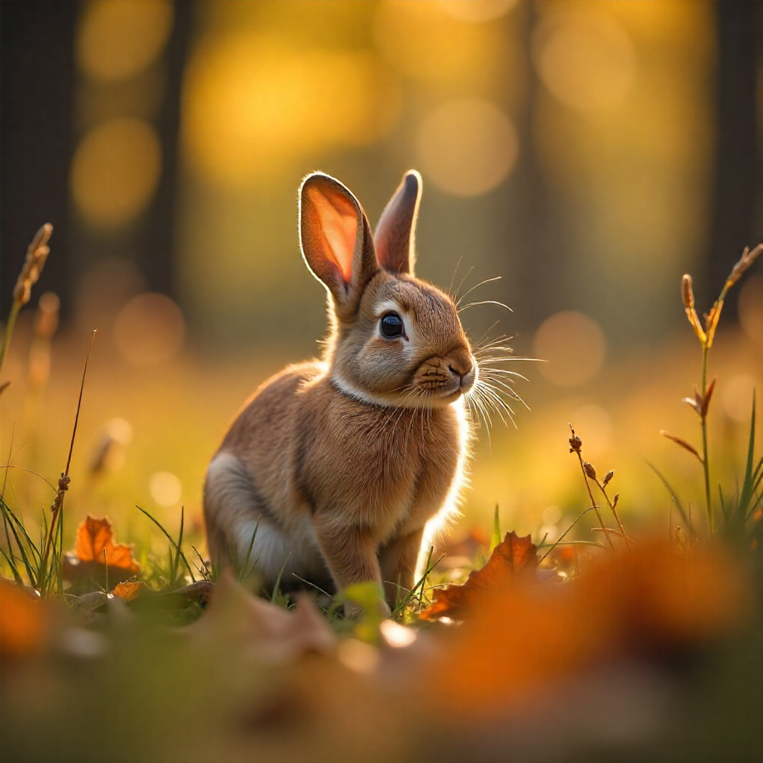 A cute rabbit sits in a sunlit autumn field, surrounded by golden leaves and warm light, creating a serene and picturesque scene.