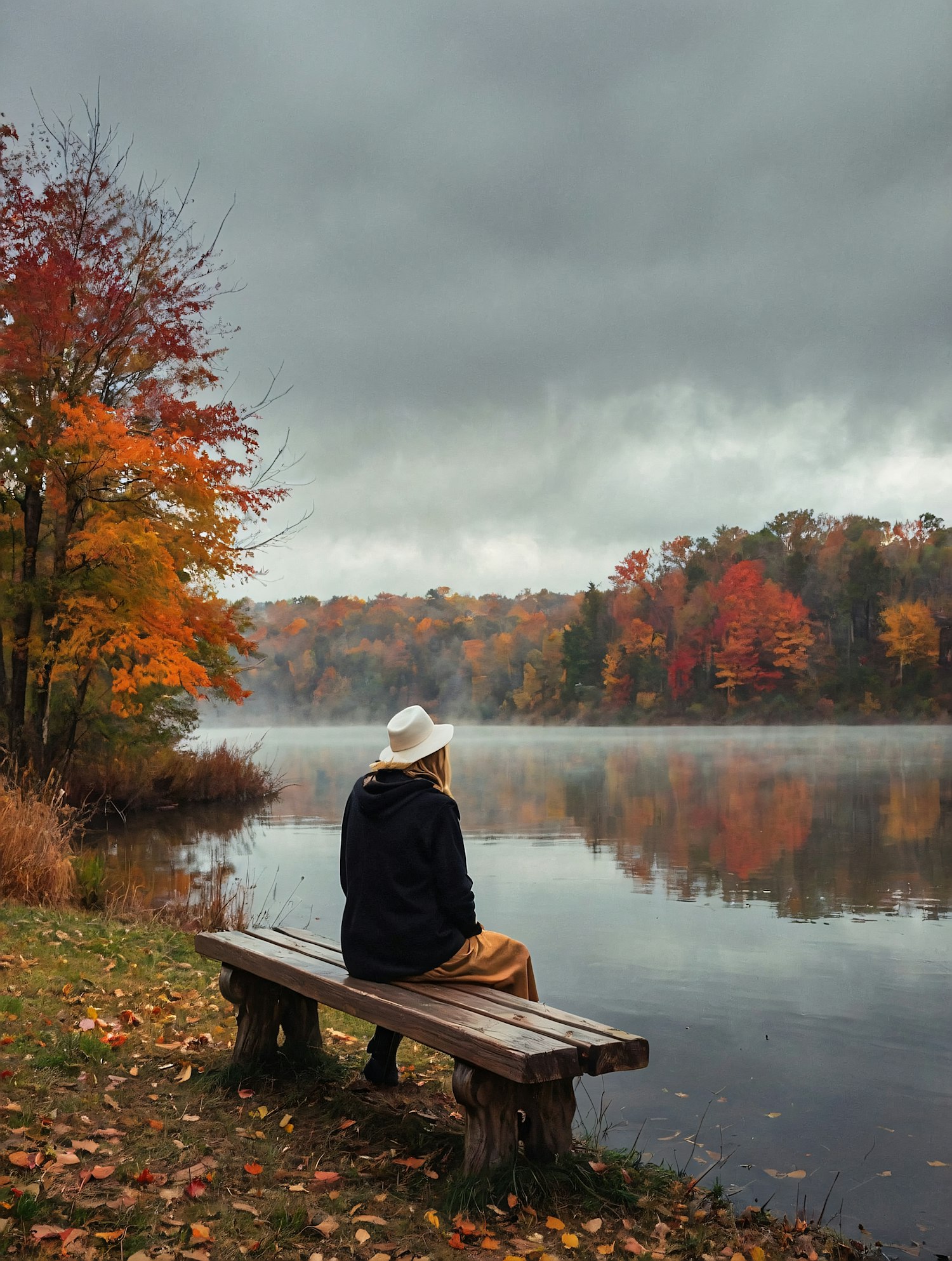 Woman in white hat sits on a bench by a misty lake surrounded by vibrant autumn foliage under an overcast sky.