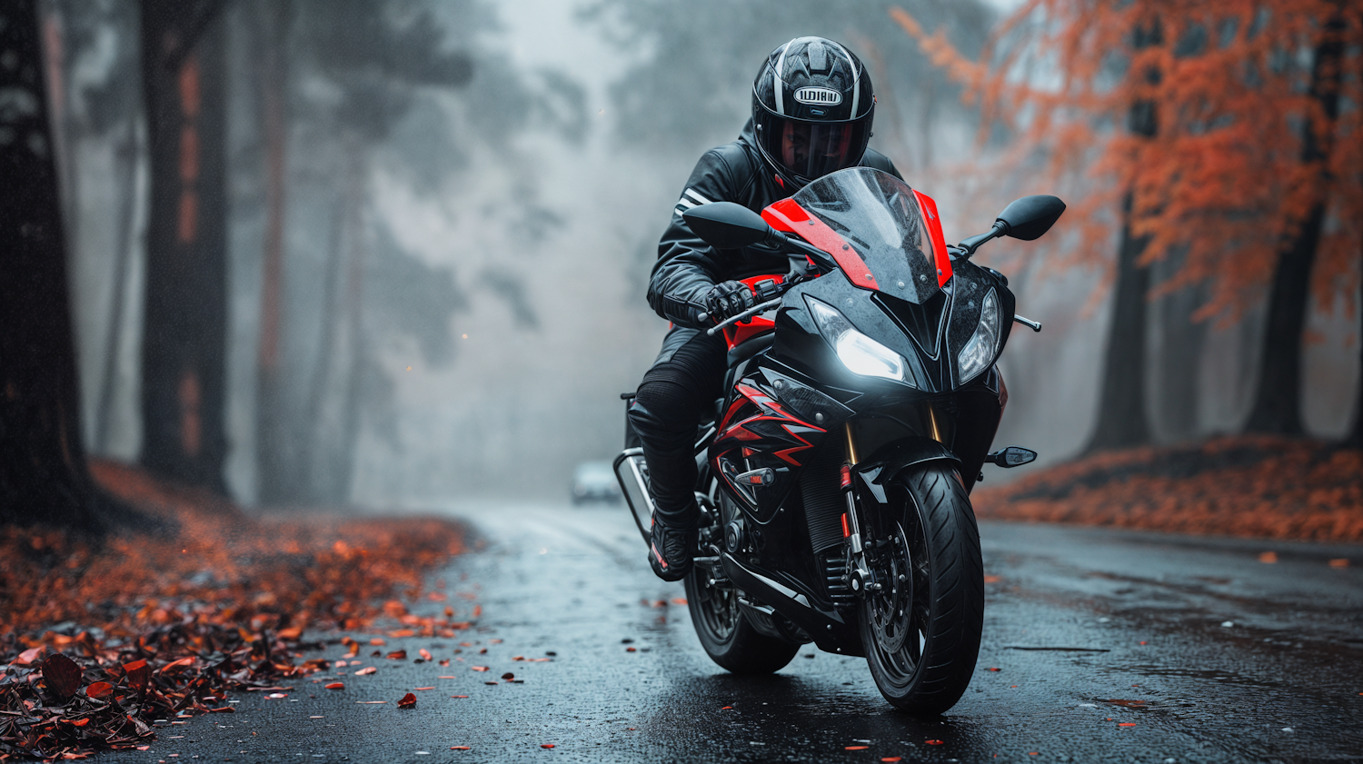 Motorcyclist on a red and black sports bike rides through a misty, autumnal forest road, surrounded by vibrant orange leaves.