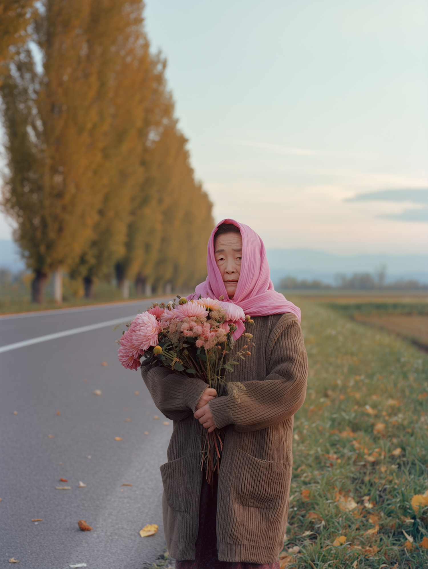 A person in a pink scarf and brown coat holds pink flowers by a road lined with autumn trees under a soft, colorful sky.