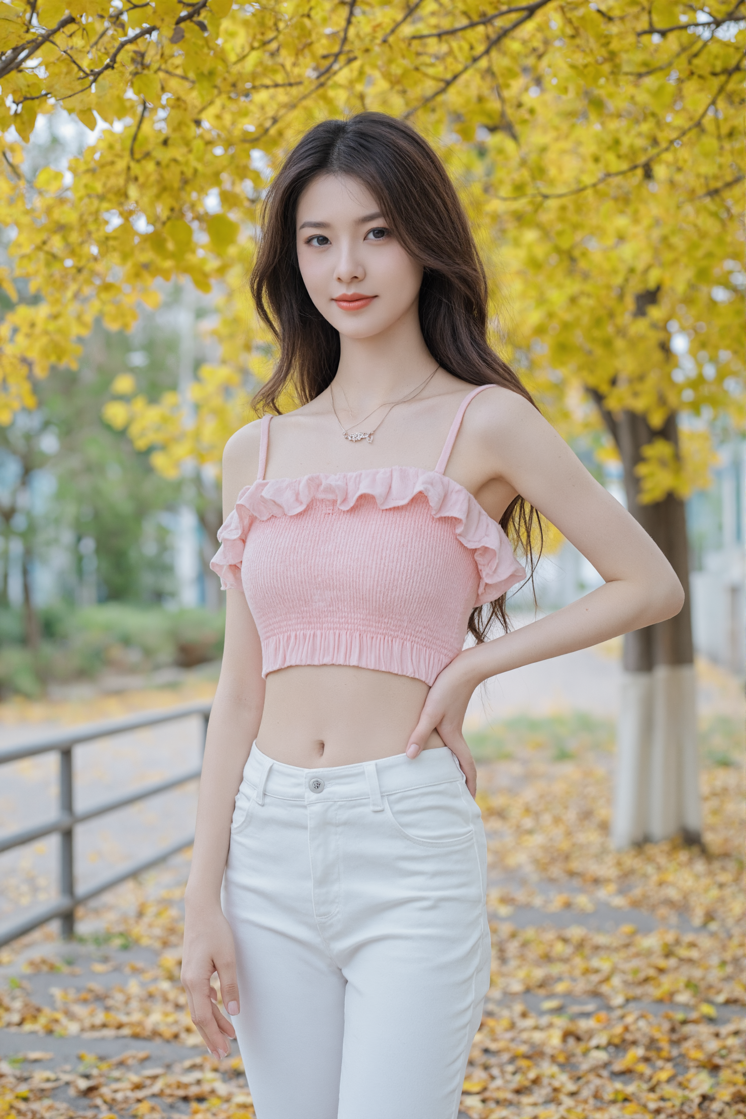 Asian woman in pink crop top and white pants amidst vibrant yellow autumn leaves, exuding a stylish and serene vibe.