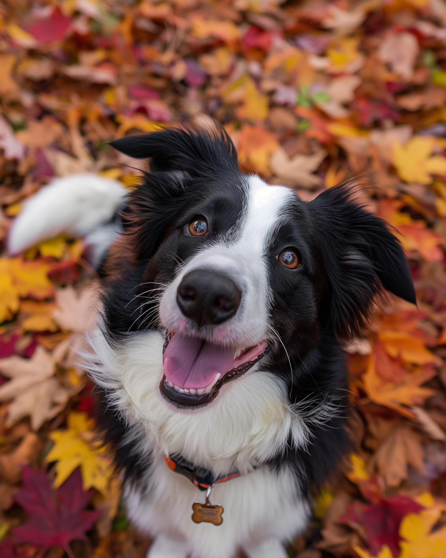 Happy Border Collie surrounded by colorful autumn leaves, showcasing joy and playfulness in a vibrant fall setting.
