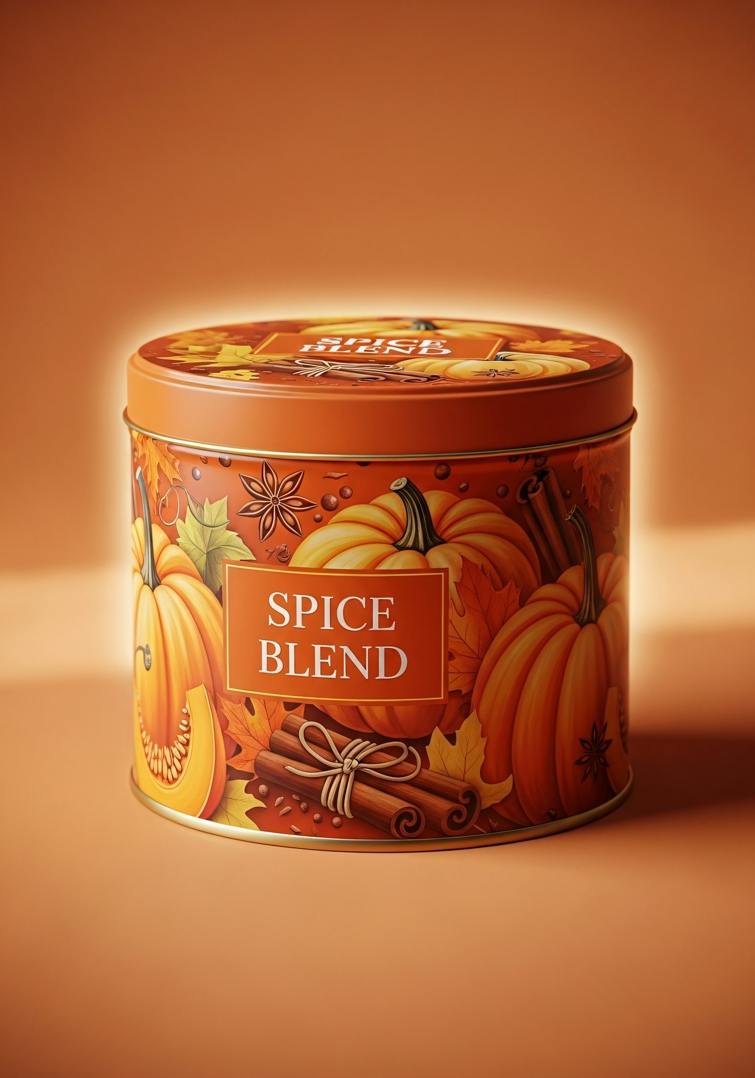 A vibrant orange tin labeled 'Spice Blend' with autumn-themed illustrations of pumpkins, cinnamon sticks, and leaves, perfect for seasonal decor.