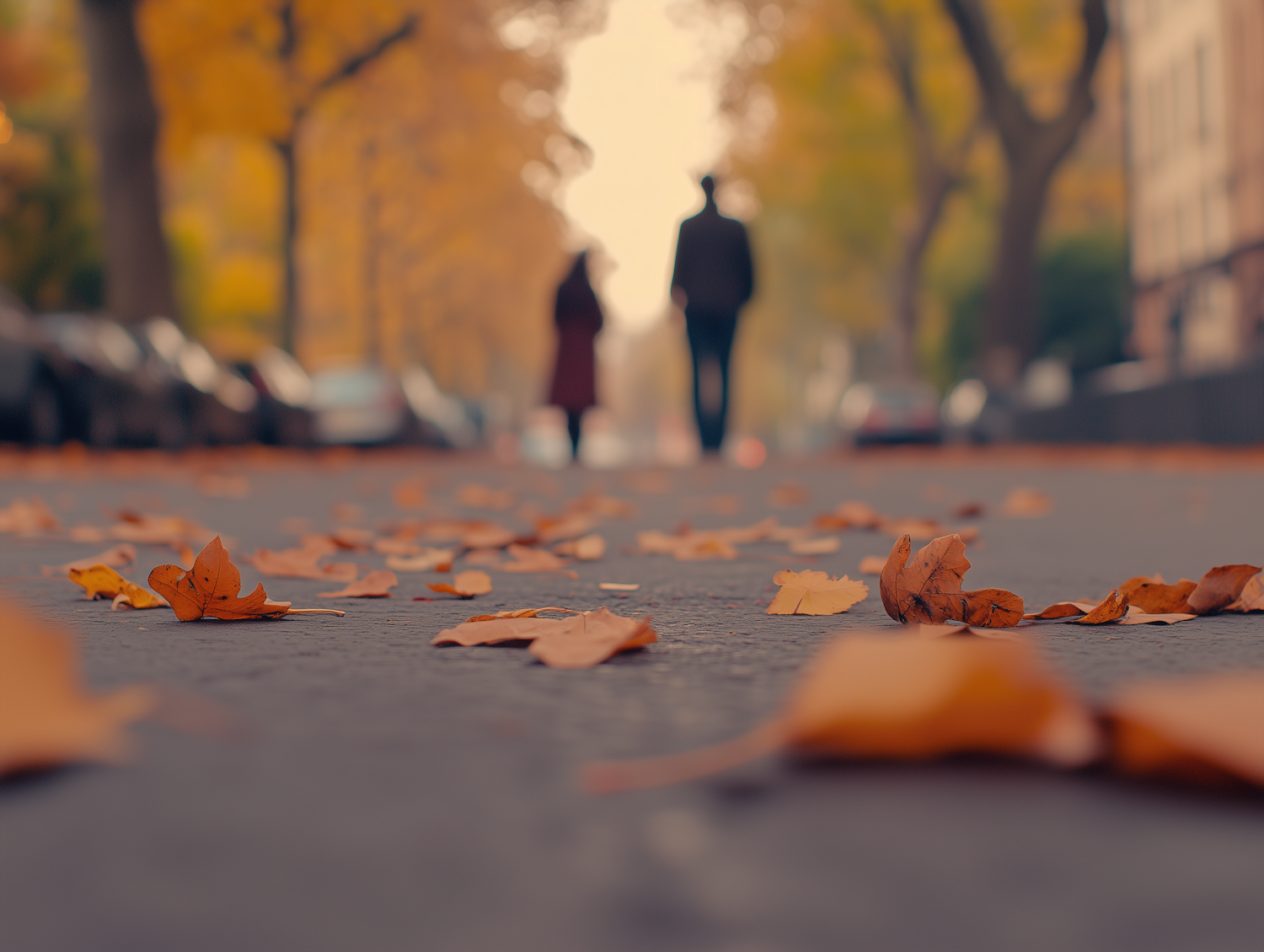 Autumn leaves on a street with blurred figures walking away, creating a serene and warm fall atmosphere.