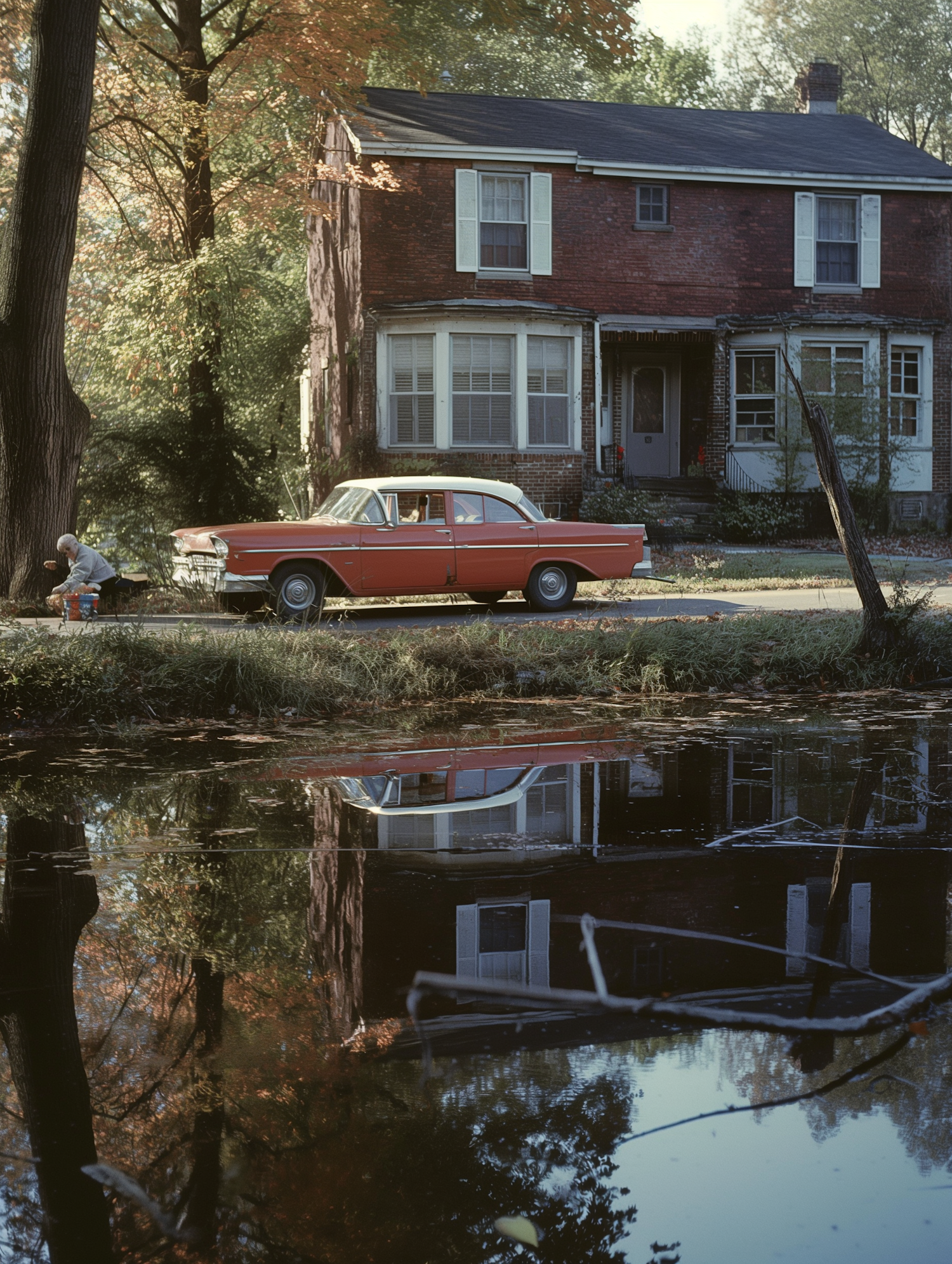 Classic red car parked by a brick house with autumn trees and a reflective pond, capturing a serene and nostalgic scene.