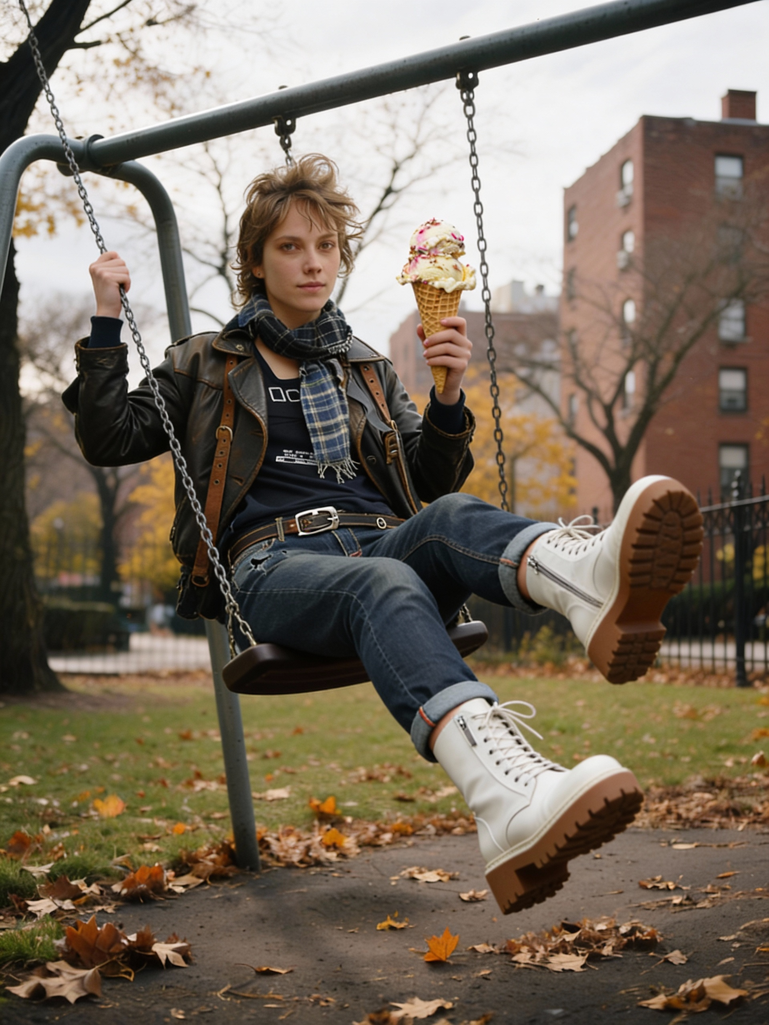 A person on a swing in a park enjoys a colorful ice cream cone, dressed in a leather jacket and white boots, with autumn leaves around.