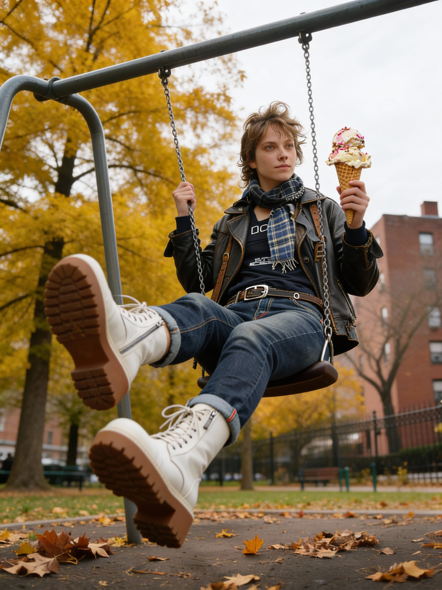 Person on a swing in a park holding ice cream, wearing a leather jacket and white boots, surrounded by autumn leaves and trees.