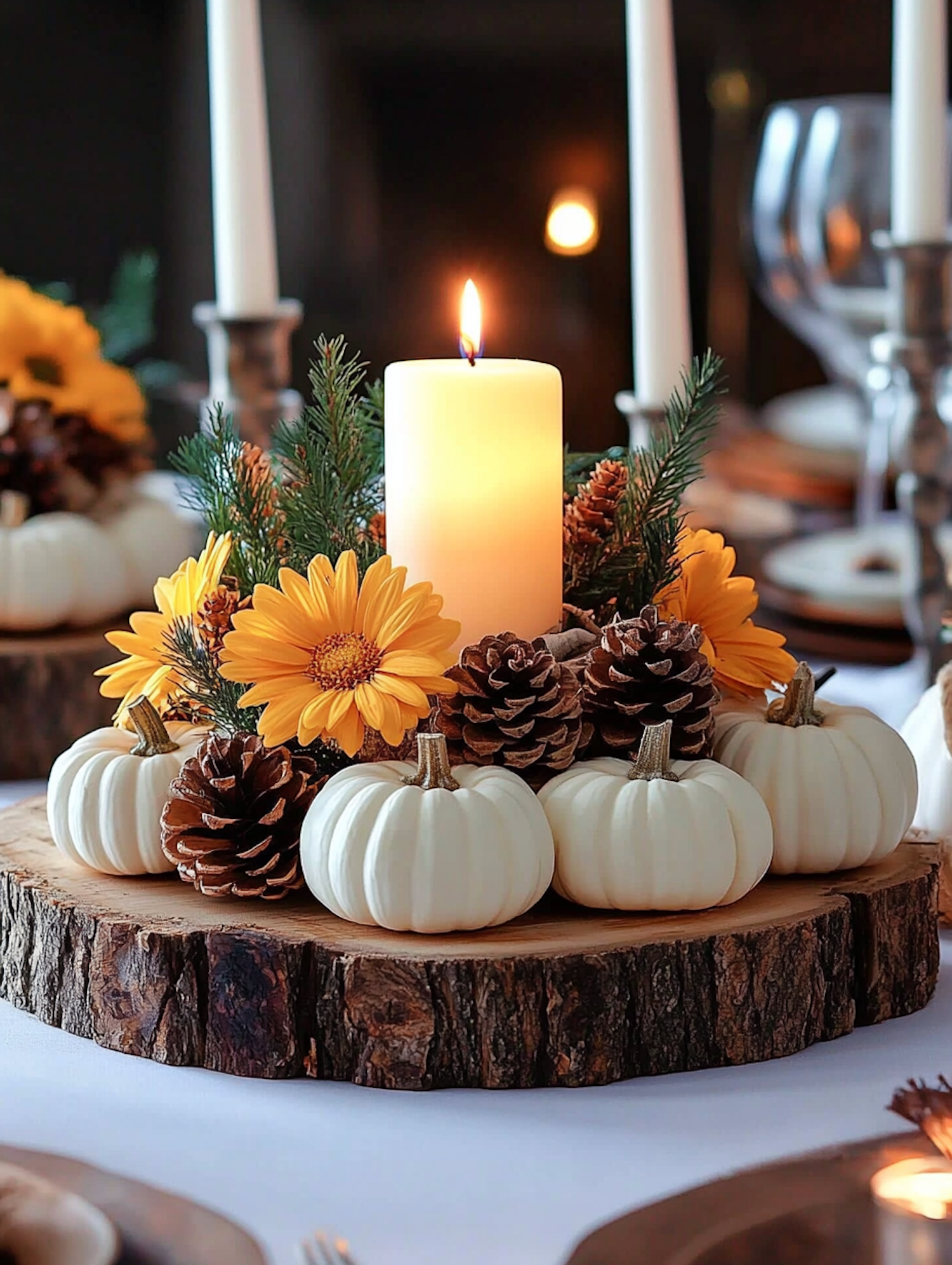 Autumn-themed centerpiece with a lit candle, white pumpkins, pinecones, and yellow flowers on a rustic wooden slab.