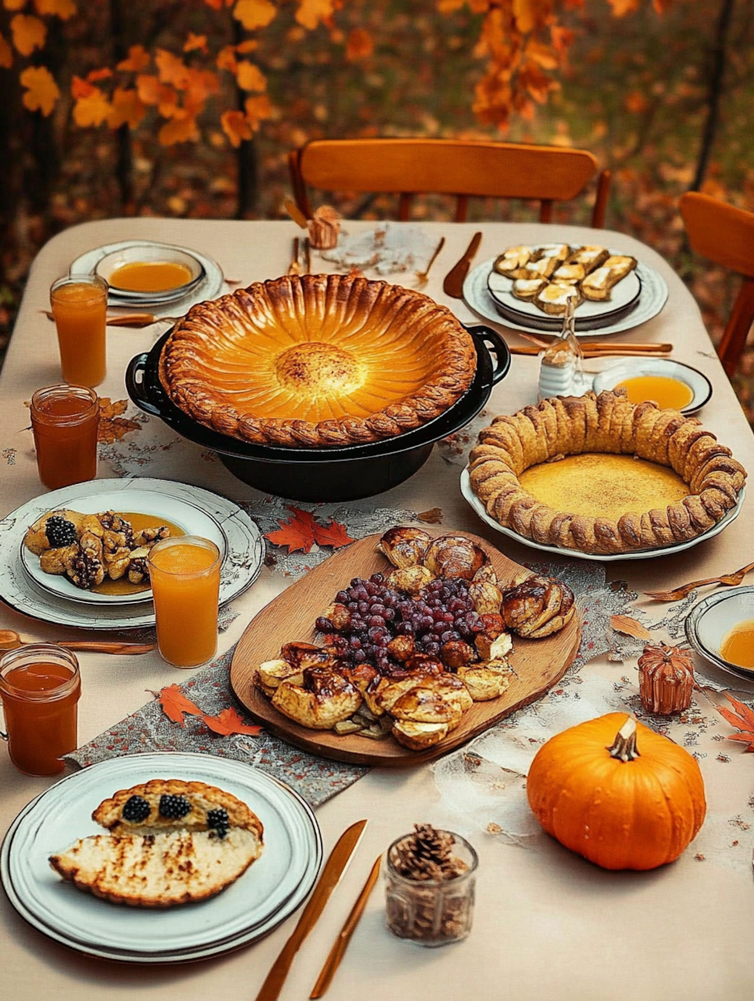 Autumn-themed table with a large pie, roasted fruits, and orange juice, surrounded by pumpkins and fall leaves.