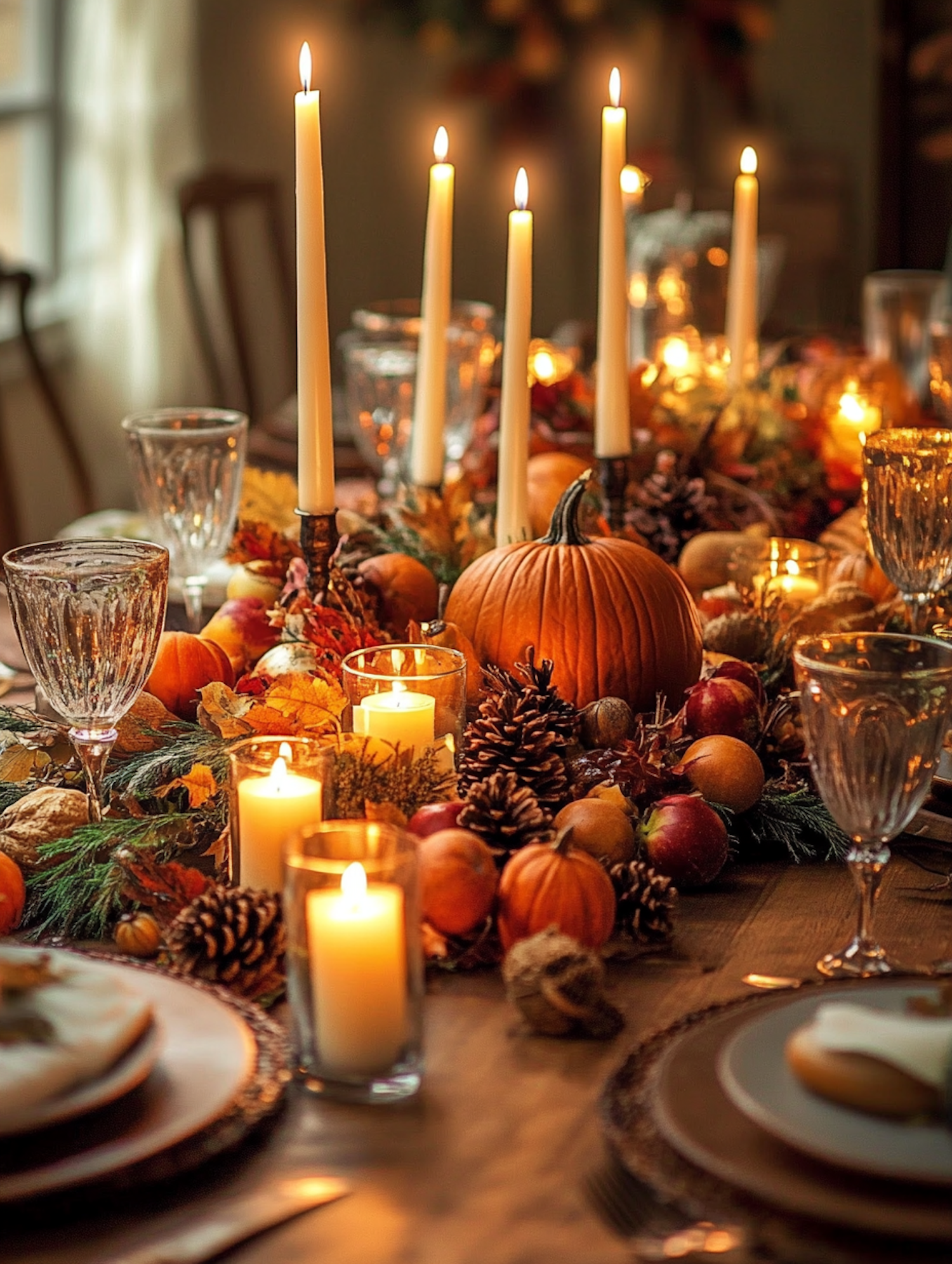 Elegant autumn table setting with pumpkins, candles, and crystal glasses, creating a warm and inviting festive atmosphere.