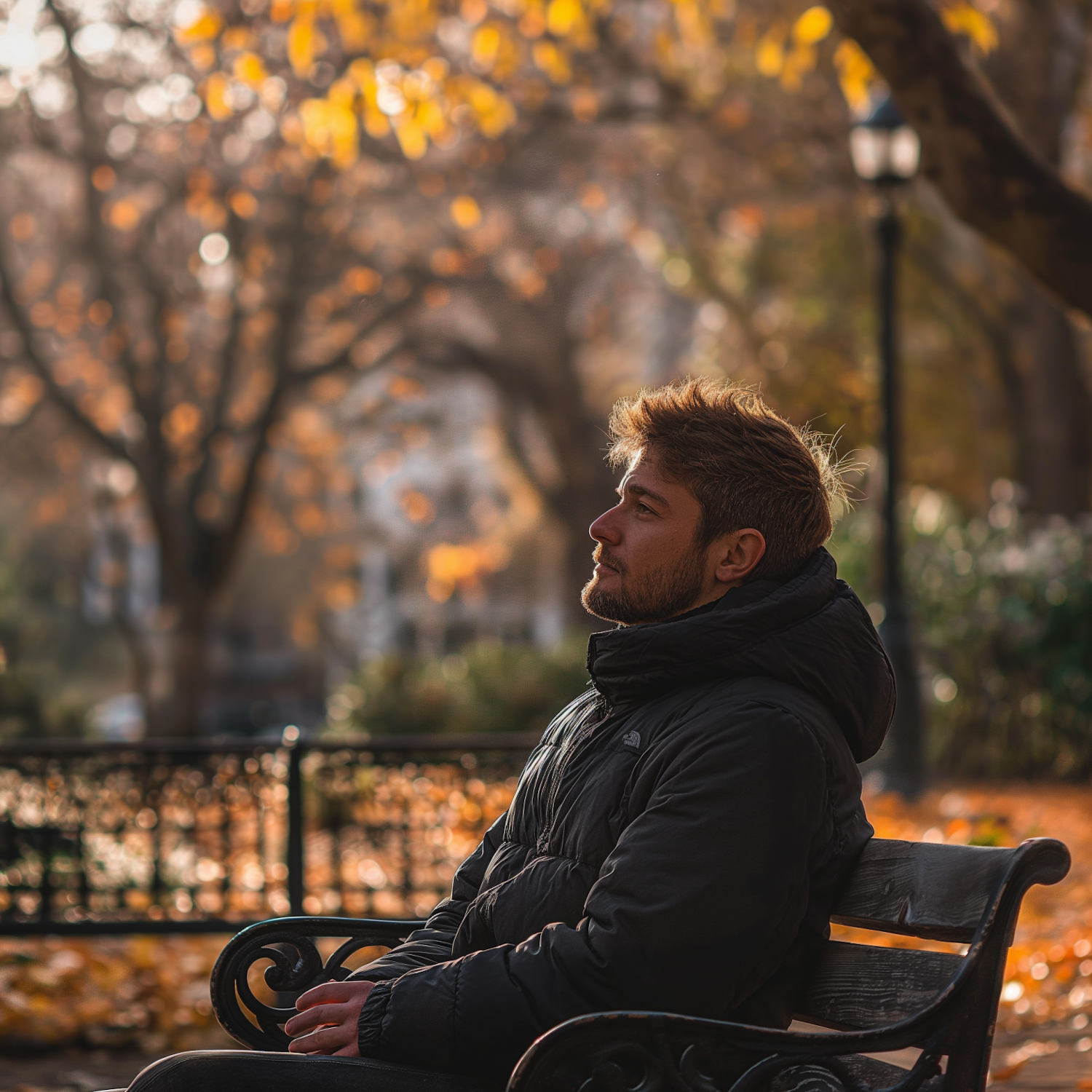 A young man in a black jacket sits on a park bench, surrounded by golden autumn leaves and soft sunlight, creating a serene mood.