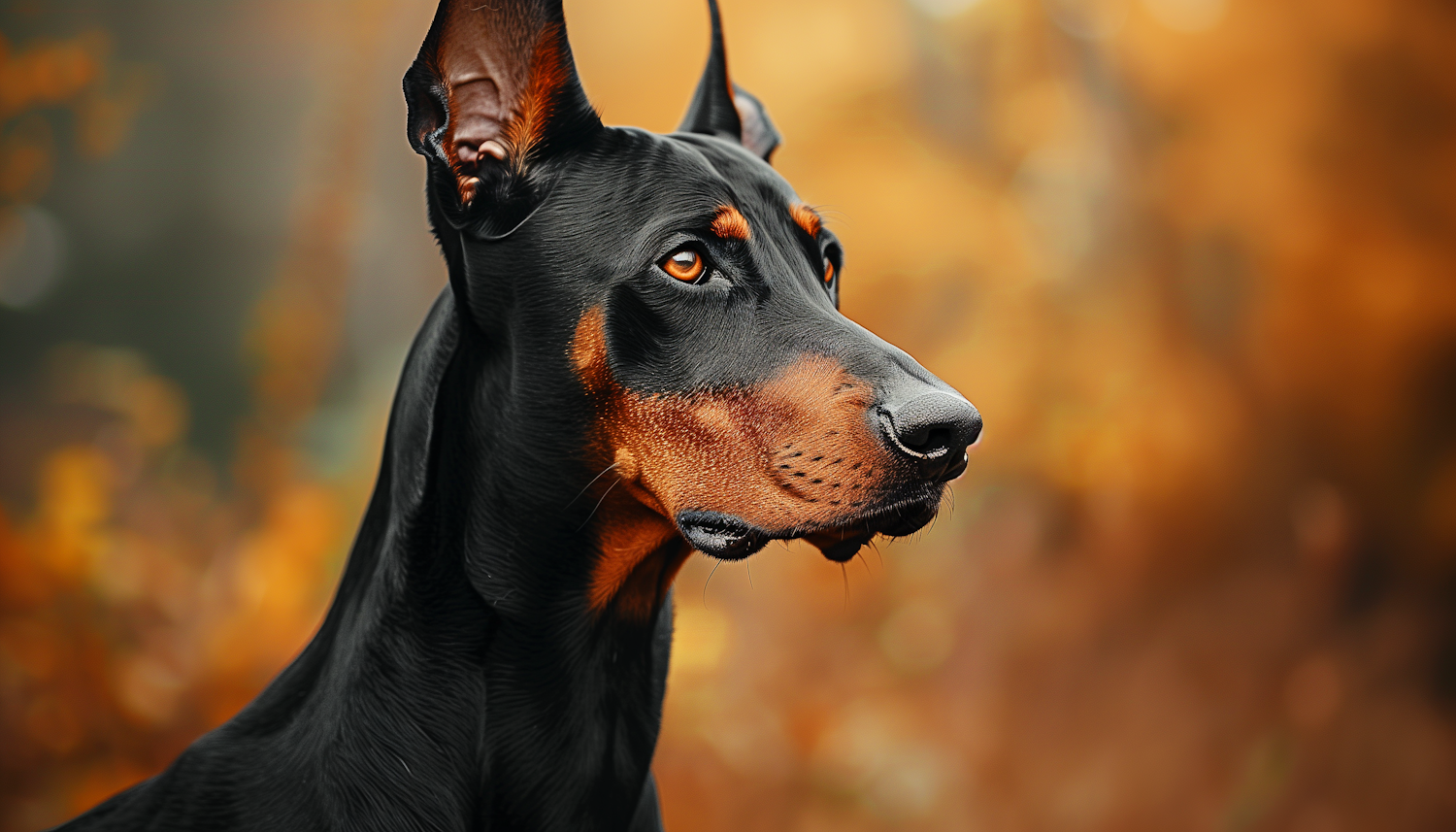 Elegant Doberman with glossy black and tan coat against a warm autumn background, showcasing alertness and intelligence.