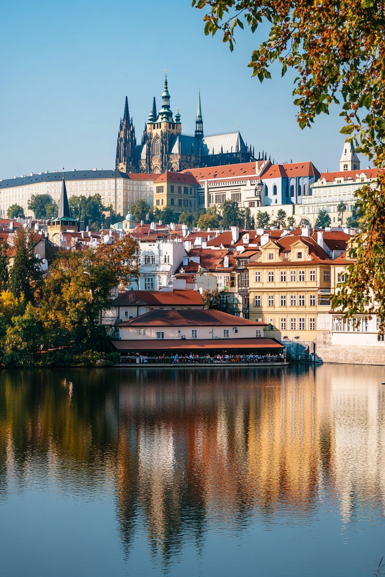 Stunning view of a Gothic cathedral and historic cityscape reflected in a tranquil river, framed by lush greenery and clear blue skies.
