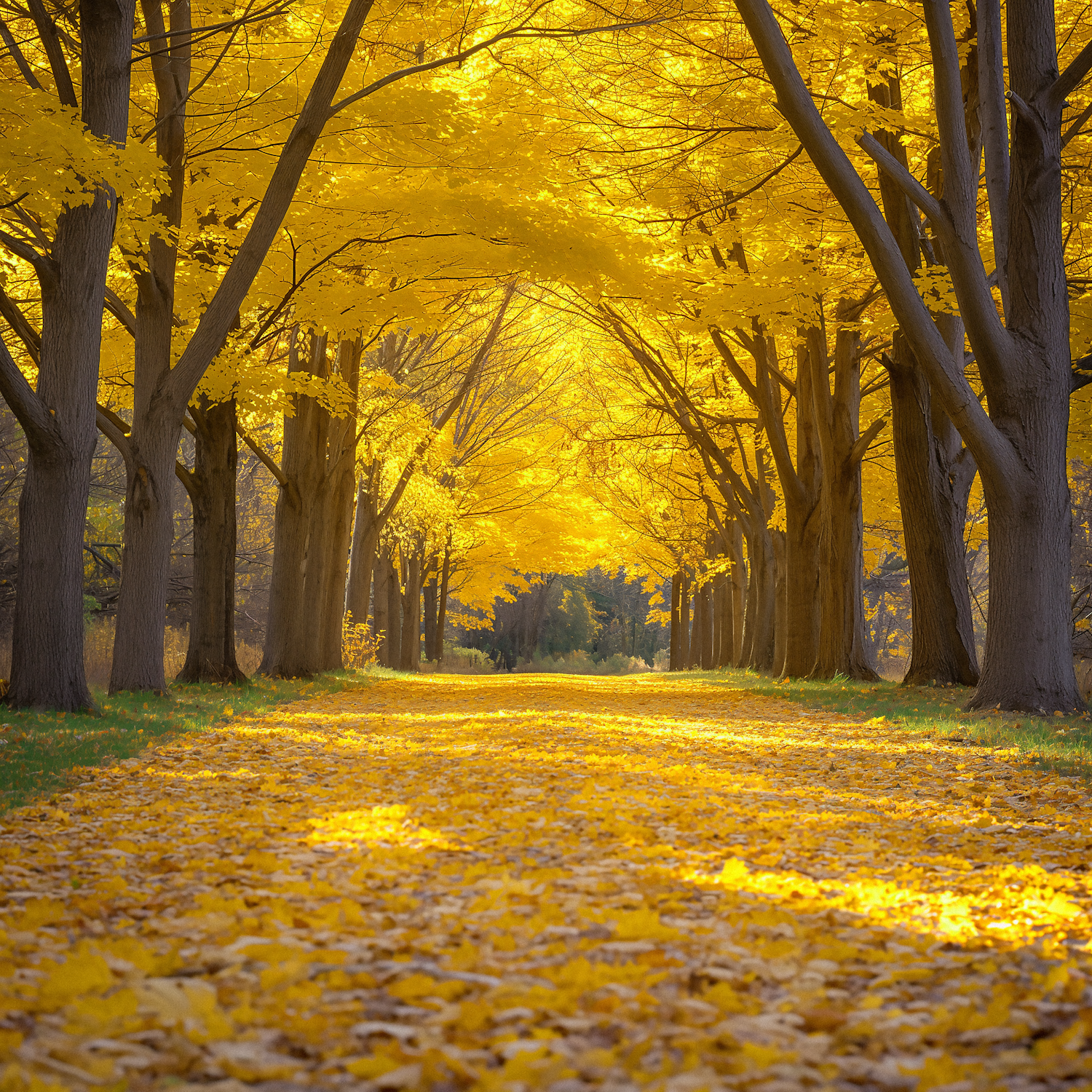 Stunning autumn path lined with vibrant yellow trees and a golden carpet of fallen leaves, creating a serene and inviting atmosphere.