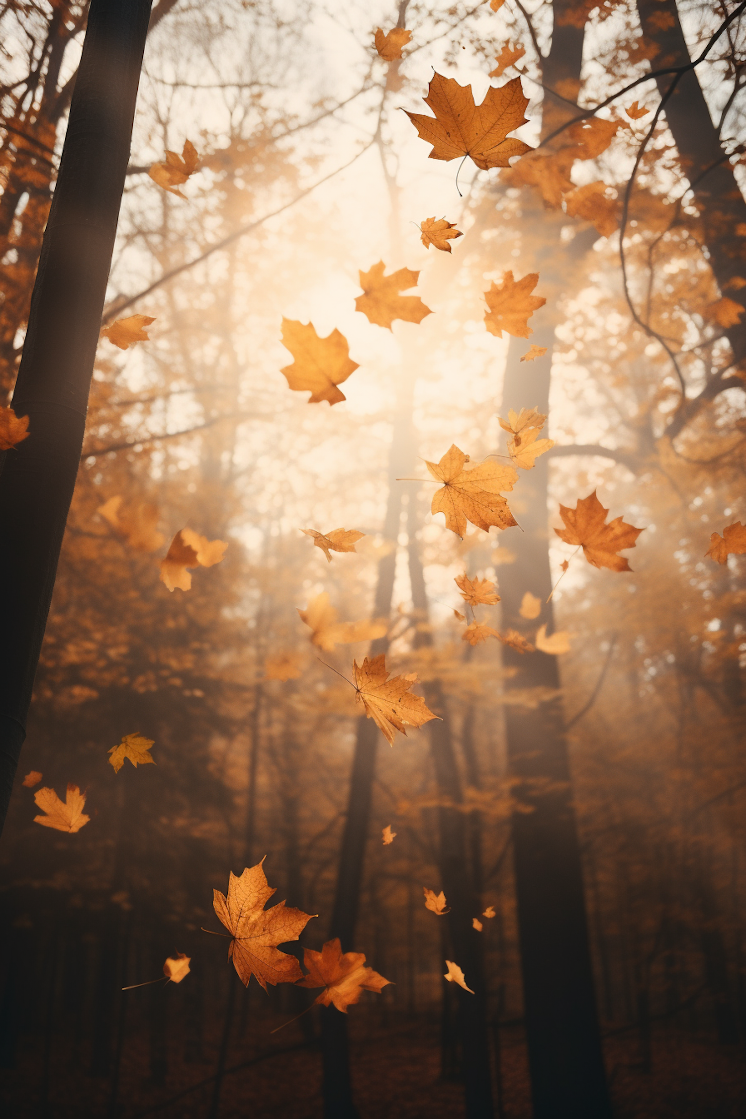Golden autumn leaves float through a serene forest, illuminated by warm sunlight, creating a tranquil and dreamy fall scene.