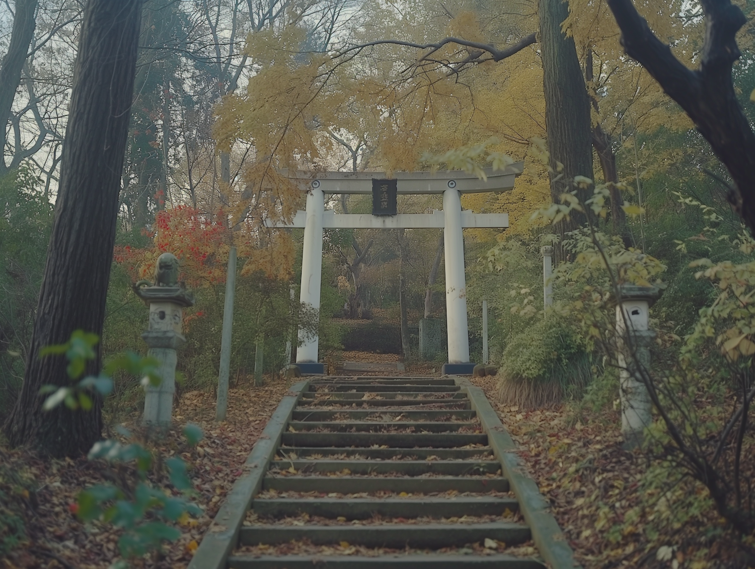 Serene forest path with a traditional Japanese torii gate, surrounded by autumn foliage and stone lanterns.