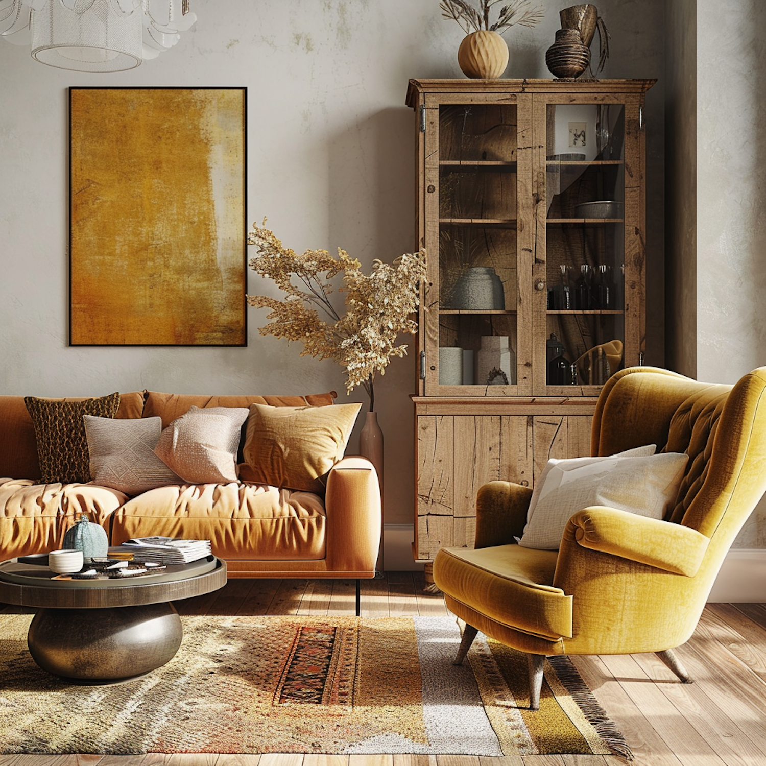 Cozy living room with mustard yellow armchair, rustic cabinet, and abstract art. Warm tones create an inviting atmosphere.