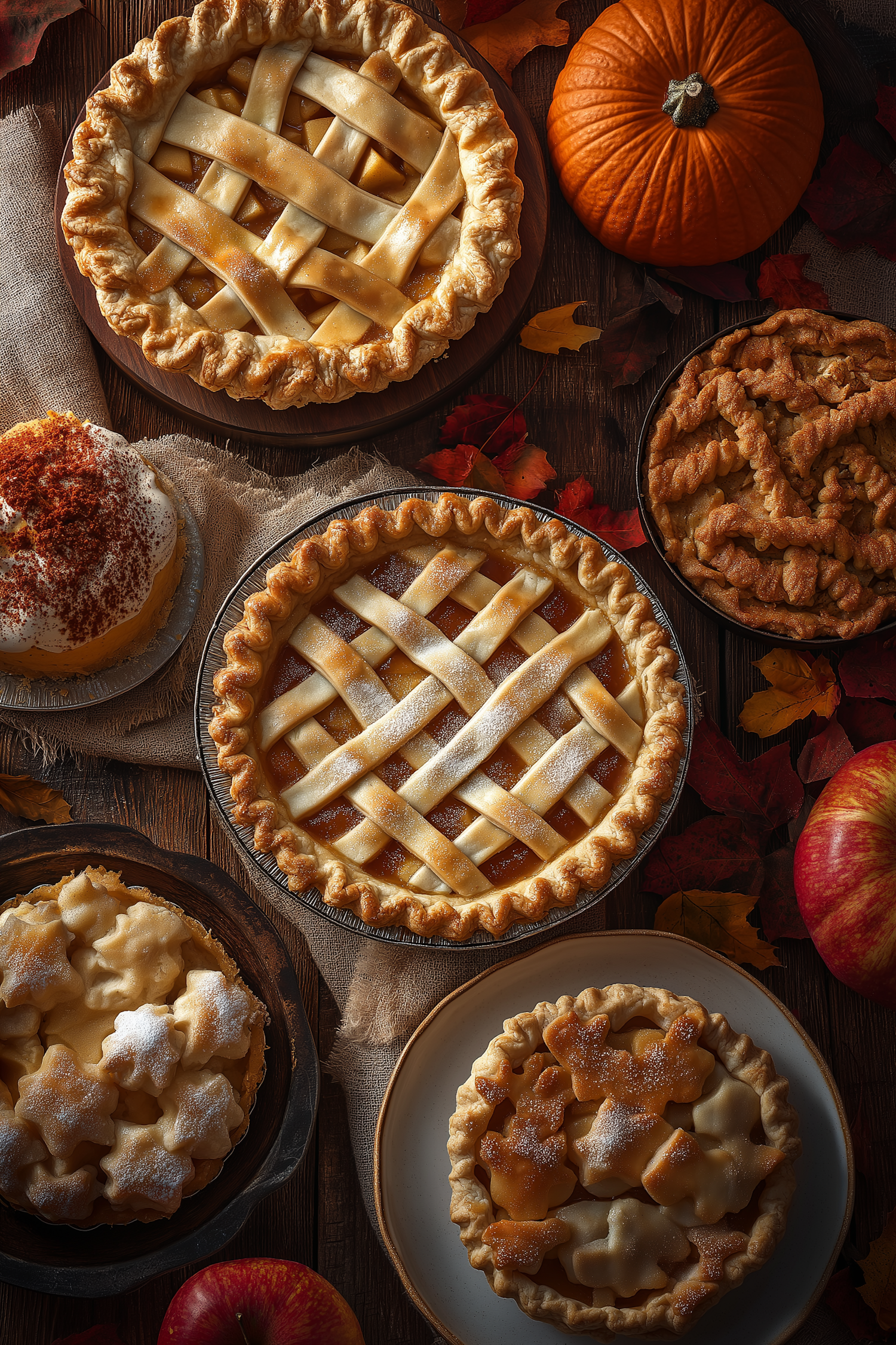 Assorted homemade pies with lattice crusts, apples, and a pumpkin on a rustic table, creating a cozy autumnal scene.