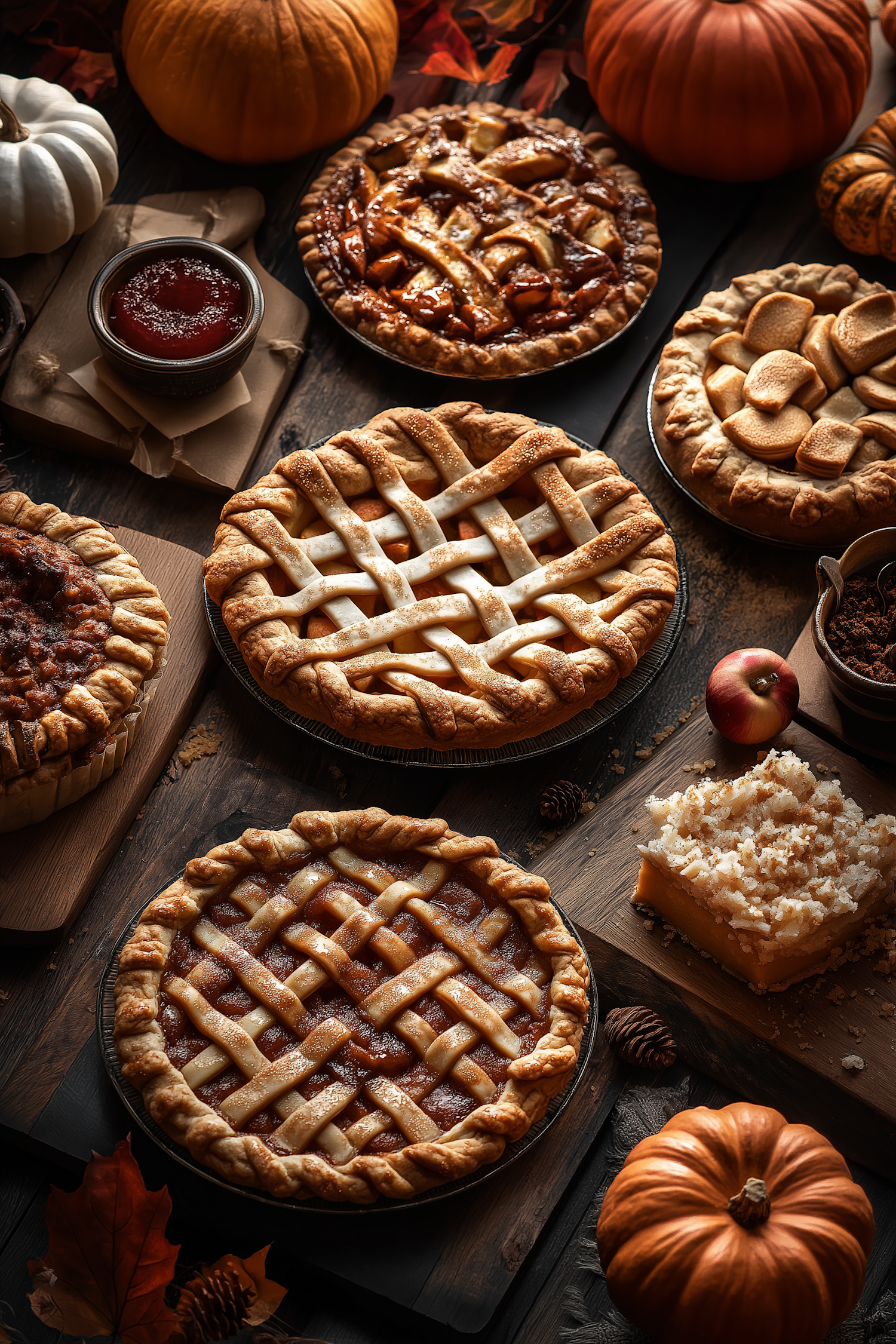 Assorted homemade pies with lattice crusts on a rustic table, surrounded by pumpkins and autumn leaves, creating a cozy fall atmosphere.