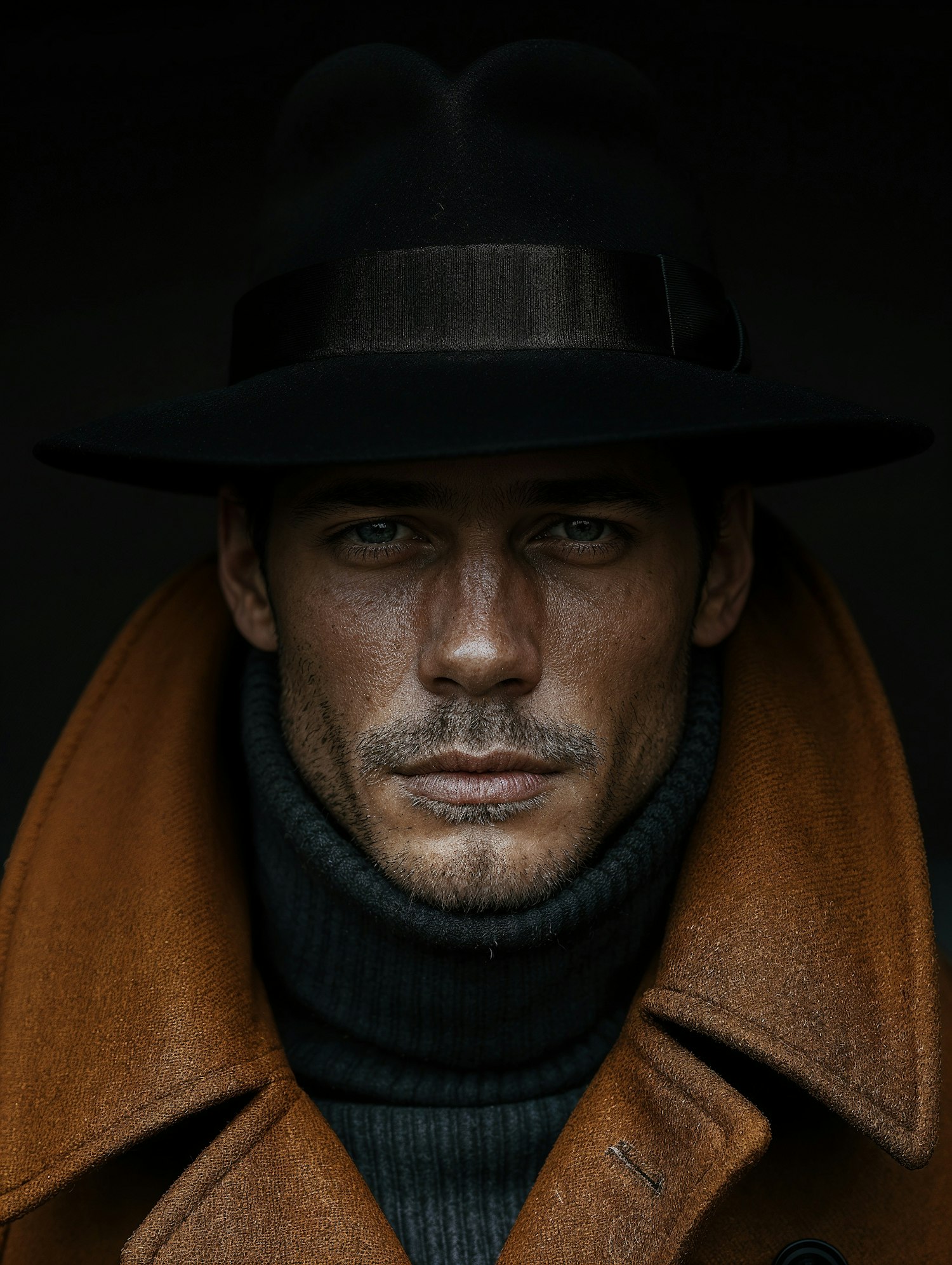 Rugged man in a black hat and brown coat, with piercing blue eyes and stubble, set against a dark background.