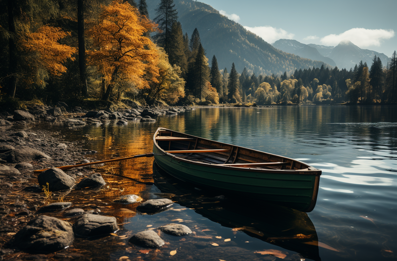 Tranquil lake scene with a green rowboat, autumn foliage, and misty mountains. Perfect for nature lovers and autumn enthusiasts.