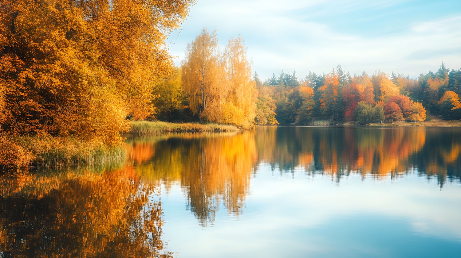 Tranquil lake with vibrant autumn foliage reflecting in calm waters, showcasing stunning yellows, oranges, and reds under a clear blue sky.