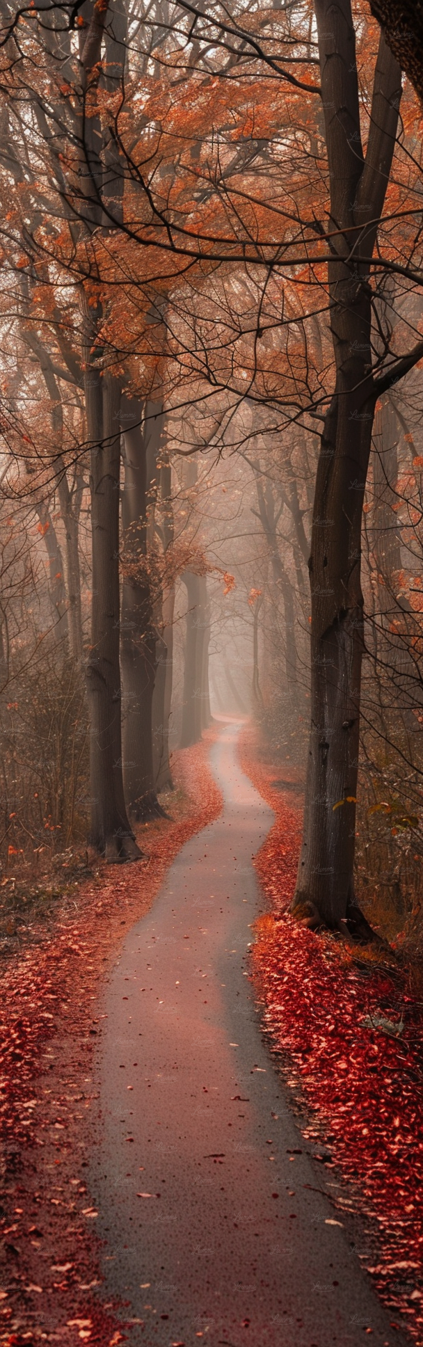 Misty forest path lined with tall trees and vibrant autumn leaves, creating a serene and inviting atmosphere.