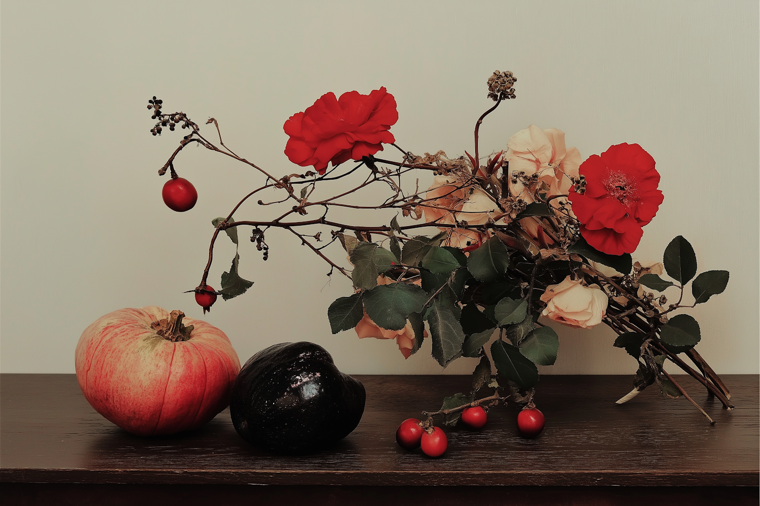 Elegant still life with pumpkins, red and peach roses, and berries on a wooden table against a light background.