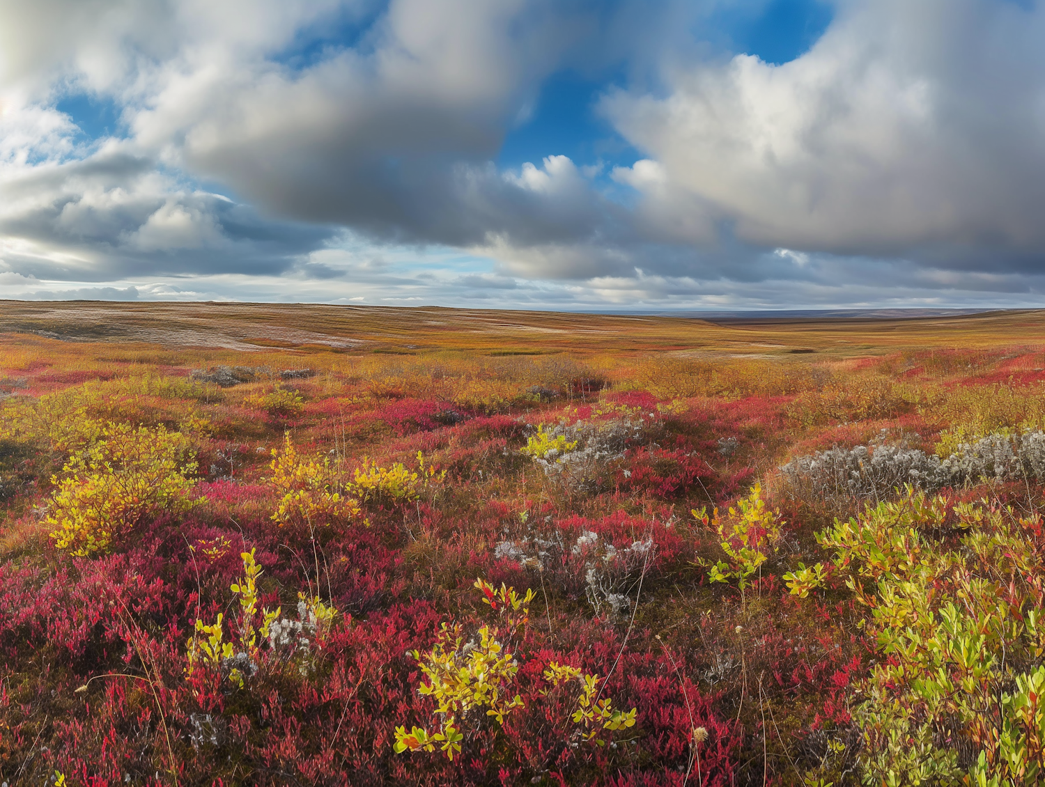 Vibrant tundra landscape with autumn colors under a dramatic cloudy sky, showcasing nature's serene beauty and vastness.