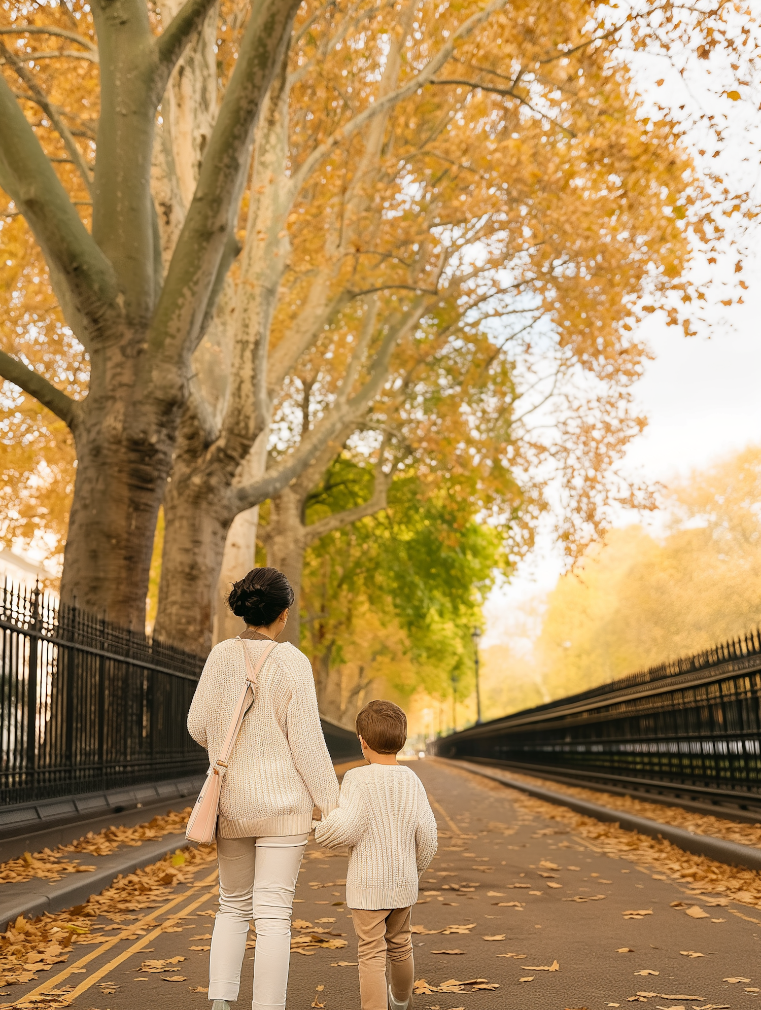Mother and child walk hand in hand down a leaf-strewn path in autumn, surrounded by vibrant fall foliage and elegant iron fences.