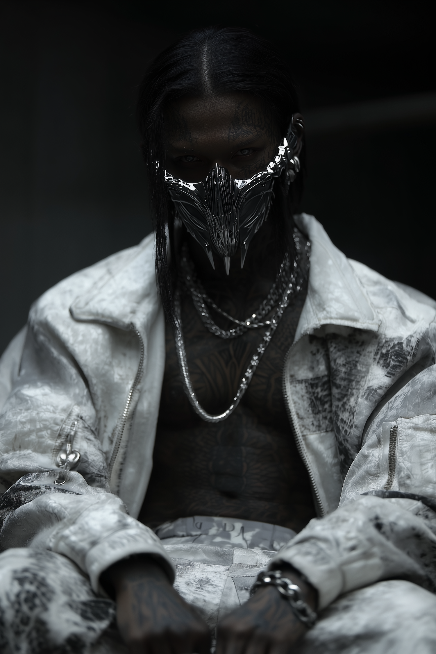Dark, futuristic portrait of a person in a metallic face mask, white stylish jacket, and intricate tattoos. Eye-catching and bold.