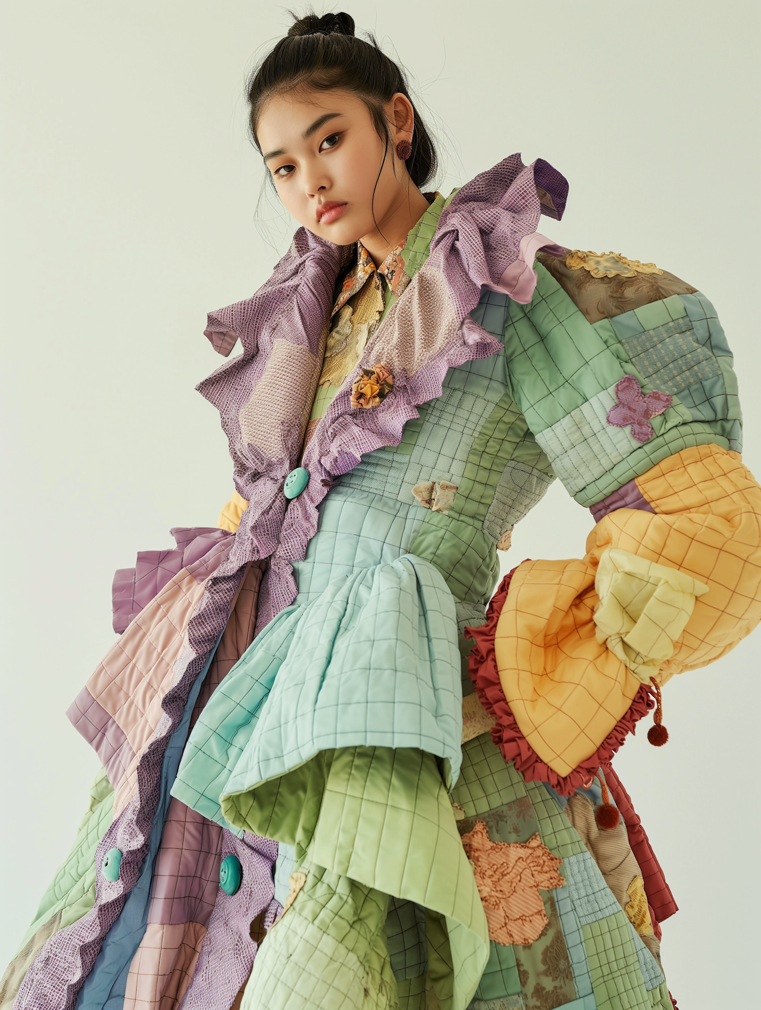 Asian woman in a colorful, quilted patchwork coat with ruffles, exuding elegance and style against a simple background.