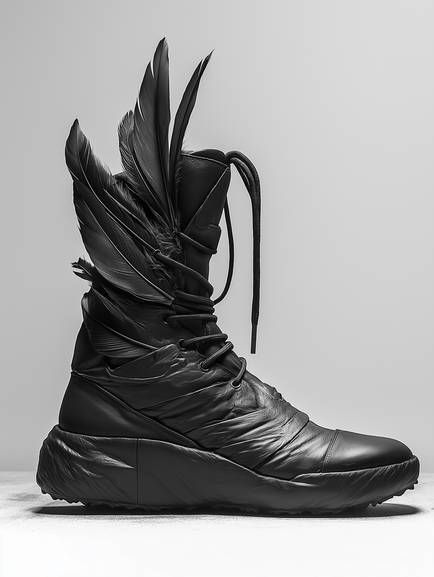 Avant-garde black boot with feather-like design, glossy finish, and textured sole. Unique high-top style with intricate details.