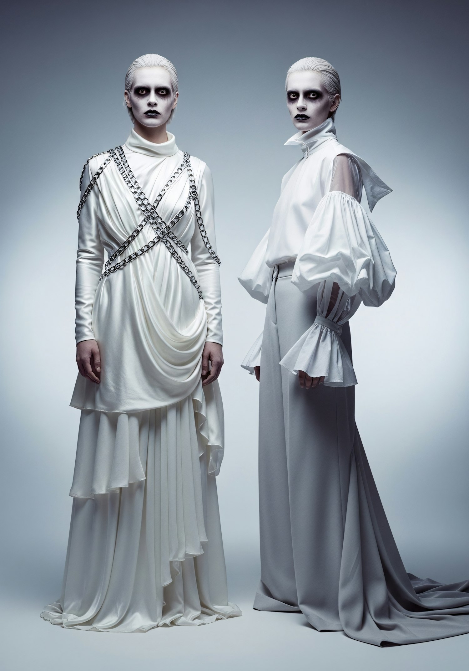 Two individuals in avant-garde white outfits with dramatic makeup, creating a surreal and artistic aesthetic in a studio setting.